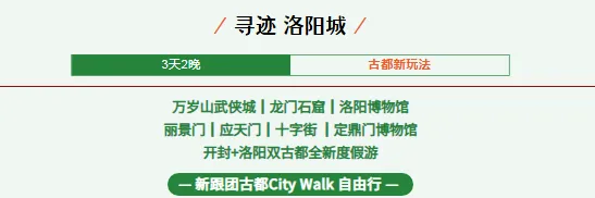 出发前往开封→【万岁山武侠城】白+黑沉浸式游览→入住指定酒店能量早餐→【定鼎门遗址博物馆】→中餐【洛阳非遗牛肉汤+海碧汽水】→【丽景门】→【十字街】→可加选【龙门石窟】含导游讲解→【应天门】广场→入住指定酒店