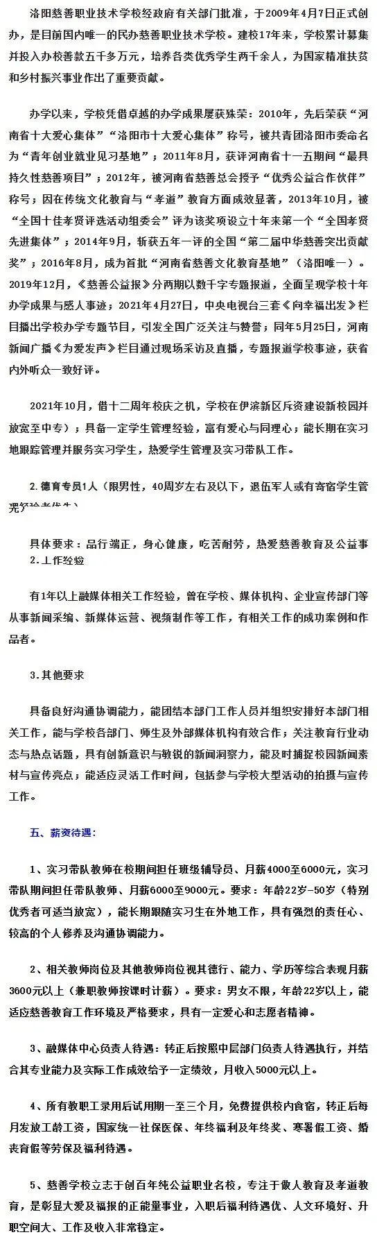 声明:本微信公众号刊载此文,无任何商业目的,纯属公益转发,目的是架起求职者和用人单位之间的桥梁,传递更多的招聘就业信息,请您找工作时候务必高度警惕各类求职陷阱。若来源标注错误或侵犯了您的合法权益,请及时与我们联系,我们将及时更正、删除或依法处理,微信号(含:商务合作):gzhzp678洛阳慈善职业技术学校2026年上半年招聘简章