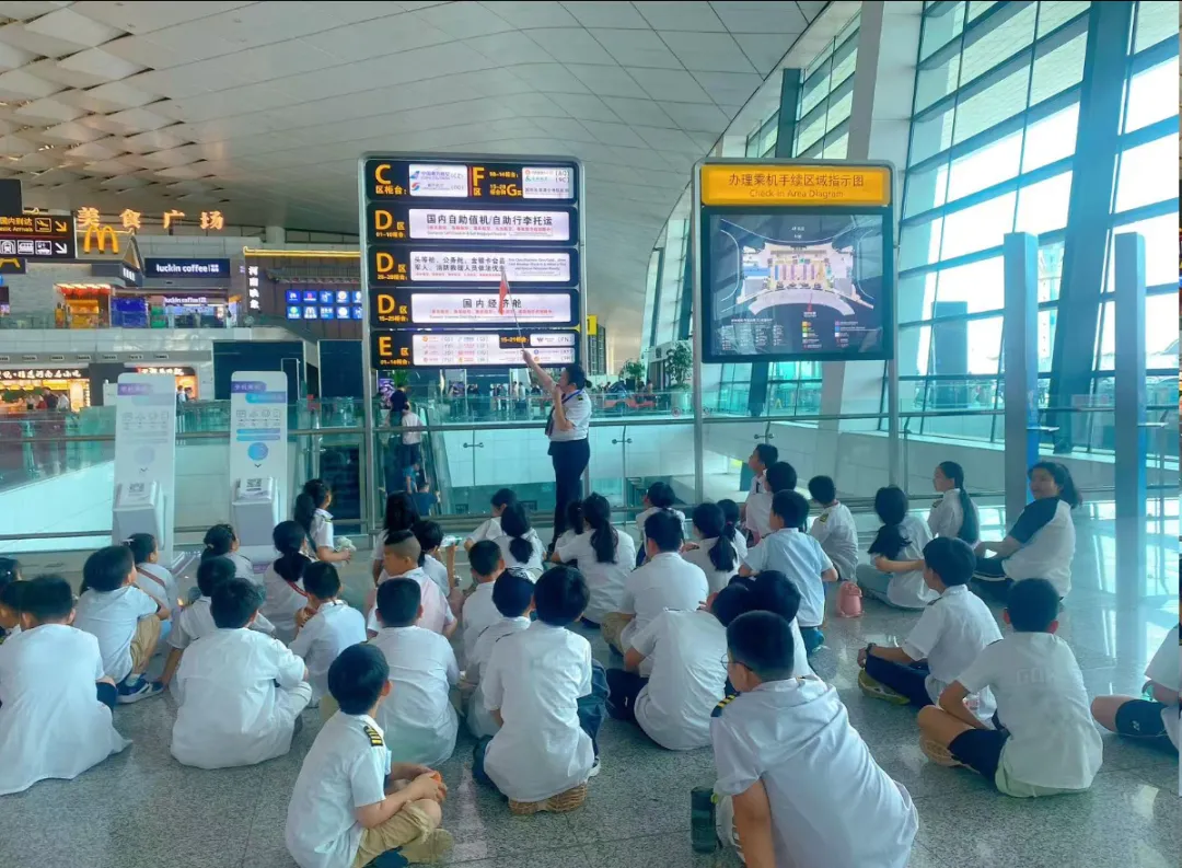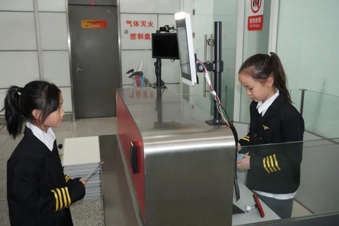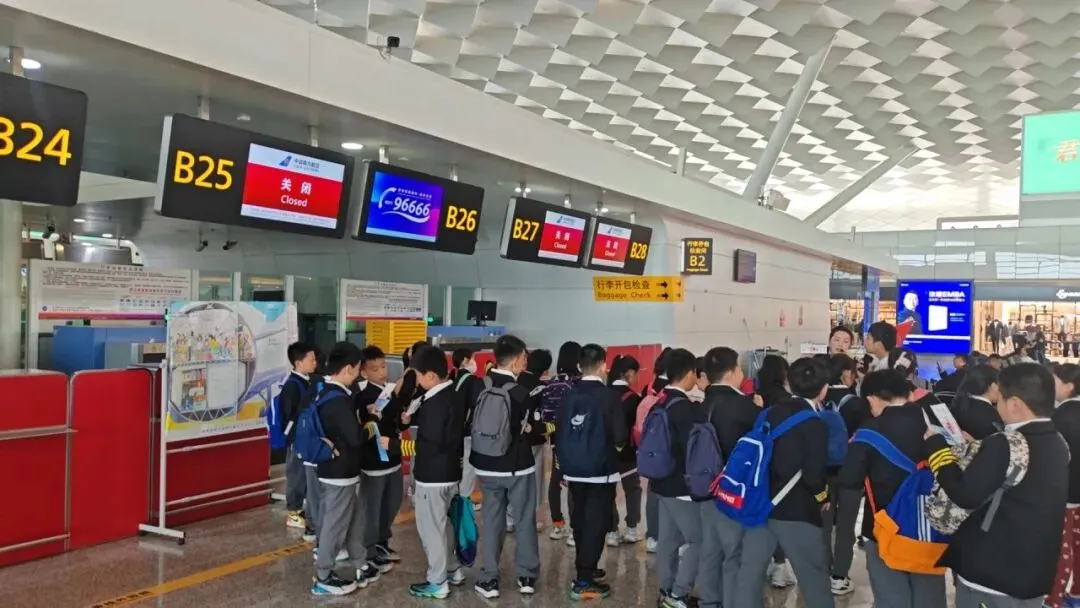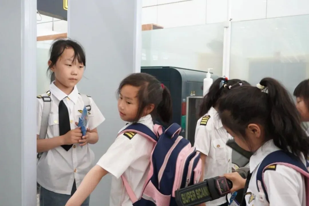 同学们将在T2航站楼真实场景中,沉浸式体验作为一名乘机出行的旅客如何值机办理登机牌、如何通过海关、如何通过安检(每位同学都有亲自体验的机会,而非个别代表学生)。与此同时还会了解安检有哪些注意事项、为什么不能带违禁物品登机等乘机相关知识。