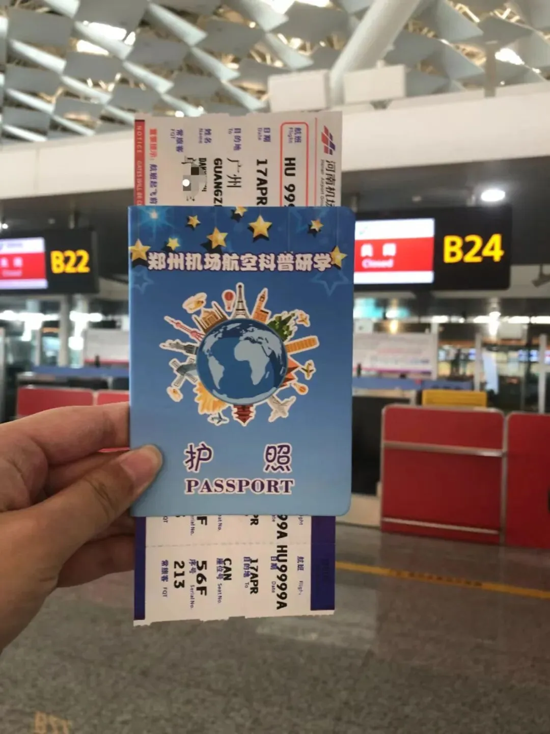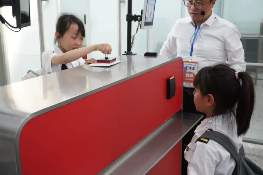 在新郑机场T2航站楼中,真实模拟体验乘机流程值机办理登机牌、安检;