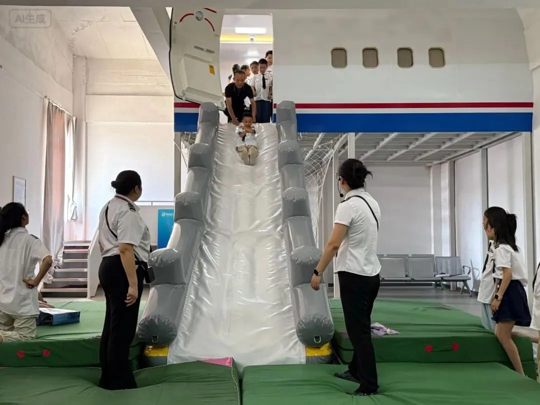 登上模拟客机,学习防冲击姿势、滑梯使用技巧,在紧张刺激的演练中,提升应急反应能力和团队协作能力