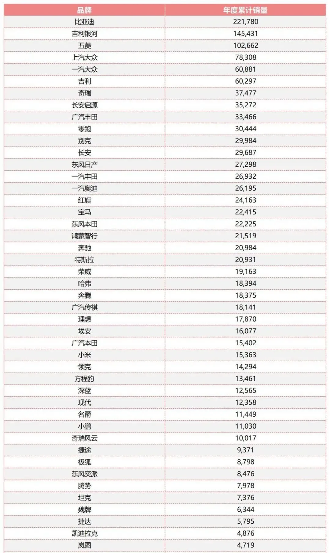 盘一盘,还有43个品牌年销超过5000台,上汽大众7.83万辆,一汽大众6.09万辆,吉利6.03万辆,奇瑞3.75万辆,传统主力没掉链子,新势力也抢眼,零跑3.04万辆,鸿蒙智行2.15万辆,特斯拉2.09万辆,理想1.79万辆,小米1.54万辆,小鹏1.1万辆,年销万辆俱乐部,座位不够坐了吧?