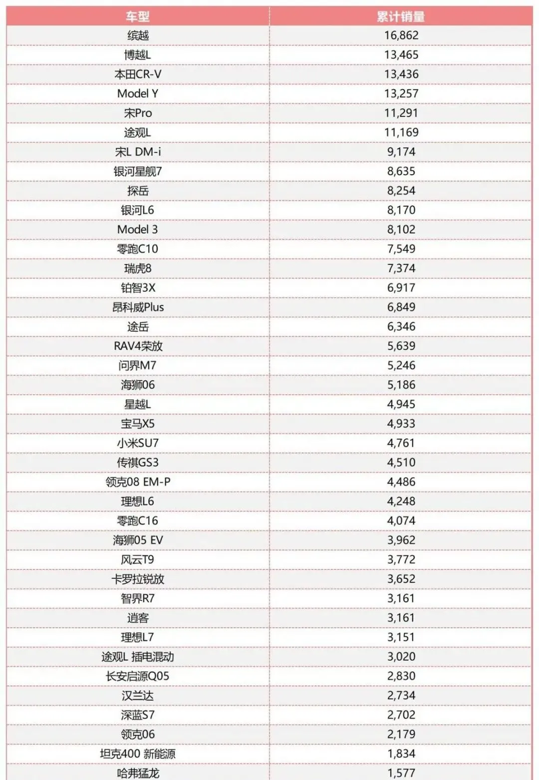 SUV这块,冠军是吉利缤越,1.69万辆,博越L1.35万辆,本田CR-V1.34万辆,Model Y1.33万辆,榜单前列挤得满满,宋Pro1.13万辆,途观L1.12万辆,宋L DM-i卖了9174辆,问界M7卖5246辆,理想L6卖4248辆,增程车型热销,也说明新能源SUV在河南的接受度,走得更快,全年看,有27款SUV卖过4000辆,竞争有多焦灼,想象一下?