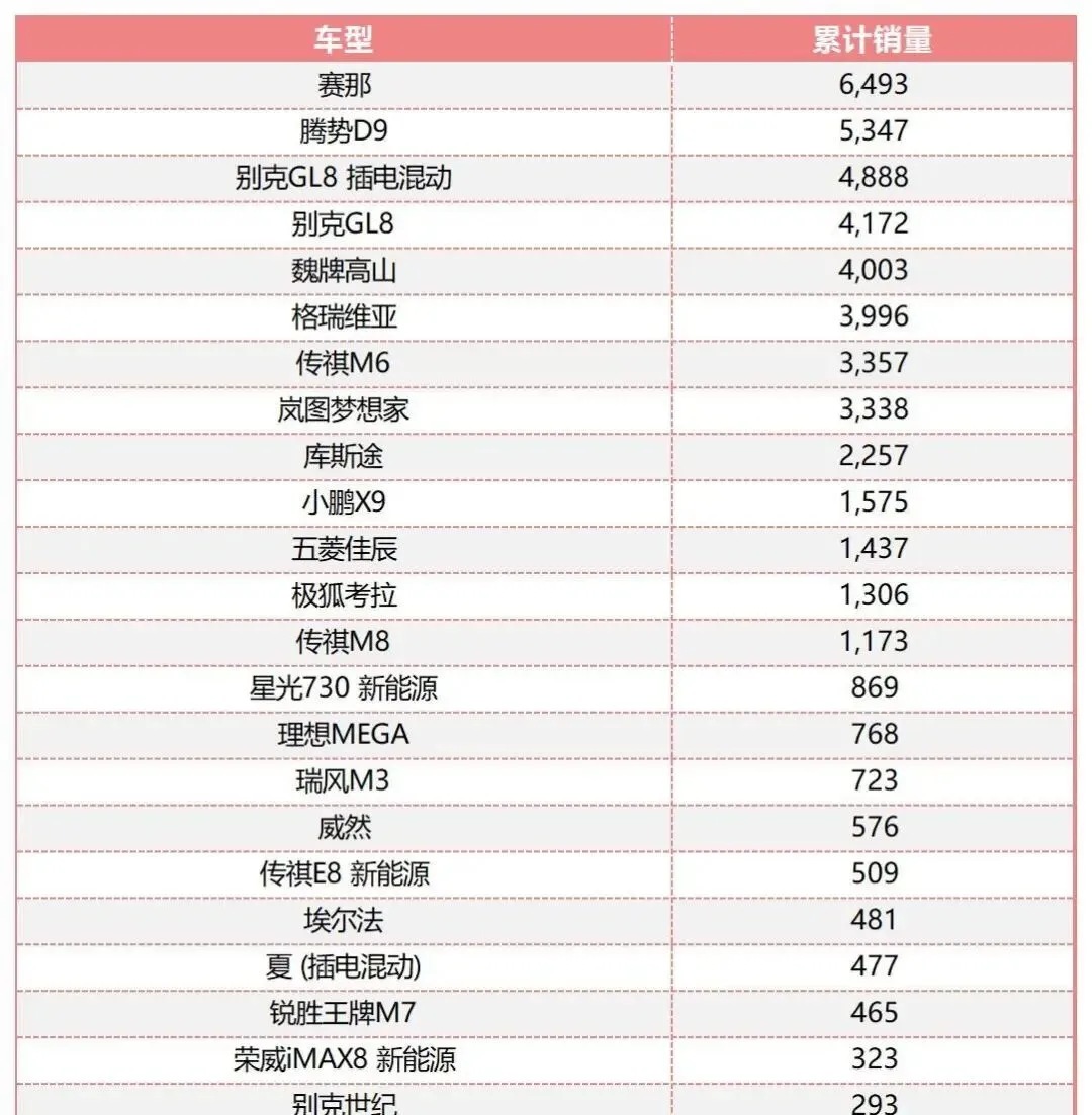 MPV市场有点意思,四强对拼,赛那6493辆领跑,腾势D9跟着走,5347辆,别克GL8合计9060辆,插混加燃油一起算,魏牌高山4003辆进前五,如果把GL8拆开看,燃油4172,插混4888,腾势D9、GL8插混、GL8燃油、魏牌高山,四款销量贴得紧,一辆车一个位次,很会打吧?格瑞维亚3996,传祺M6卖3357,岚图梦想家3338,全年有13款MPV破千,高端化、新能源化,两条线往前跑。