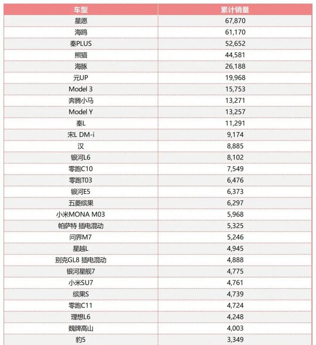 新能源车型榜再看一眼,破万的有十款,吉利星愿6.79万辆,海鸥6.12万辆,秦PLUS5.27万辆,熊猫4.46万辆,海豚2.62万辆,元UP2万辆,Model 31.58万辆,奔腾小马1.33万辆,Model Y1.33万辆,秦L1.13万辆,比亚迪占了五席,统治力不解释,特斯拉双车在榜,表现稳,微型电动车热卖,还是那句话,代步要实惠,河南用户认。