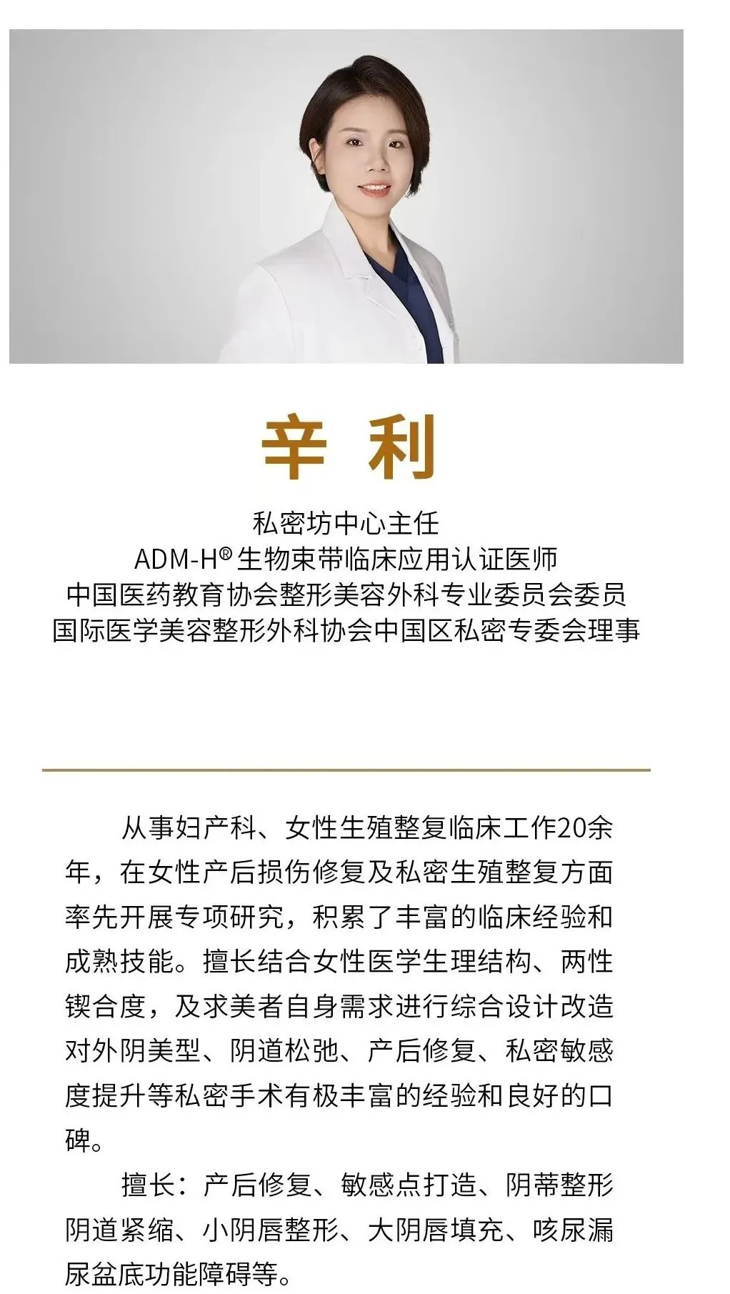 辛利主任接诊后,详细了解她的流产史和身体状况,结合其生理结构及两性锲合度,制定了微无创黏膜修复+私密紧致调理的联合方案,延续“精、细、稳、准”的治疗风格,全程微无创、无不适感,主任还全程贴心叮嘱术后护理和作息要点,尽显专业与温柔。辛利主任不仅有20余年临床经验,还多次参加国际国内学术研讨会,在流产后私密修复方面造诣深厚。