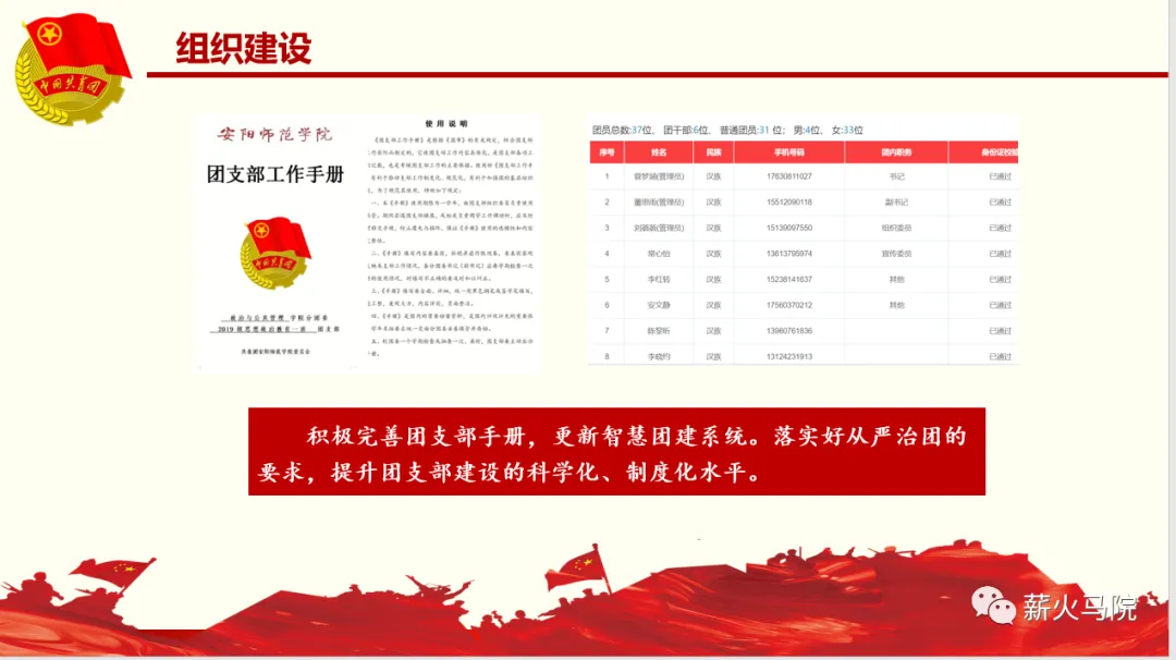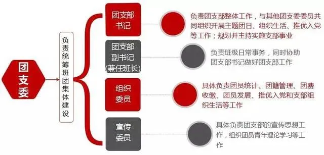 马克思主义学院2019级思想政治教育一班团支部设有团支部委员会,支部成员们政治立场鲜明、专业素质强硬。团支部书记负责整体工作,与其他团支委委员共同组织开展主题团日、组织生活、推优入党等工作,规划并主持实施支部事业;班长兼任支部副书记,负责班级日常事务,同时协助团支部书记做好团支部工作;组织委员具体负责团员统计、团籍管理、团费收缴、团员发展、推优入党和支部组织生活等工作;宣传委员具体负责团支部的宣传思想工作,组织团员青年理论学习等工作。
