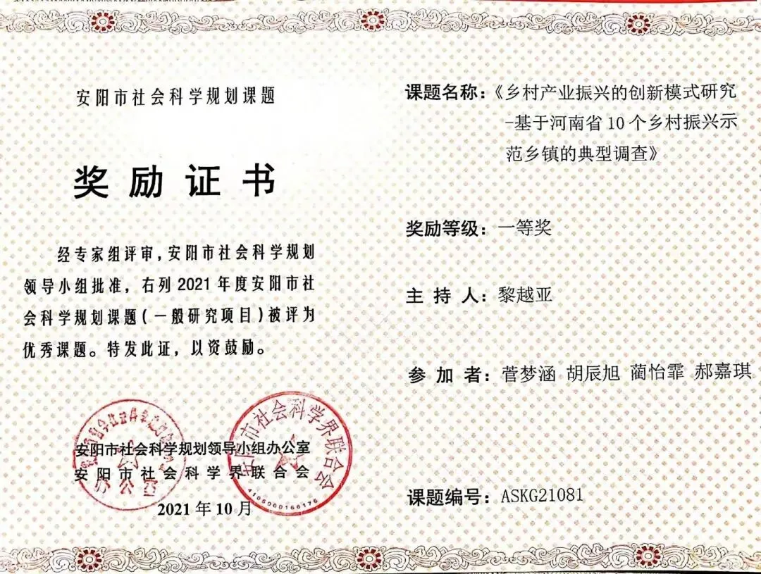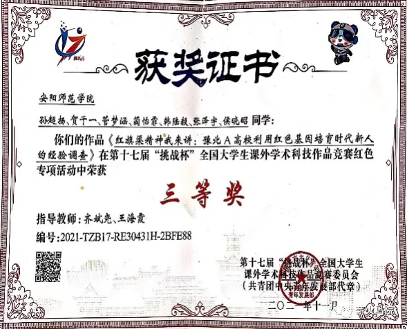 马克思主义学院2019级思想政治教育一班团支部成员积极参与各项活动与实践,在校园创作的舞台上、在科研创新的探索中、在社会实践的道路上、在志愿服务的第一线,都有着支部成员活跃的身影,不断彰显支部活力,亮出支部风采。在科研创新的探索中,支部成员蔺怡霏等多位团员积极参与2021年挑战杯“传承红色基因,践行初心使命”红色专项活动,并荣获国家“三等奖”。同时,菅梦涵、胡辰旭等支部成员积极参加2020年“挑战杯”全国大学生课外学术科技作品竞赛,团队作品荣获省级“二等奖”。