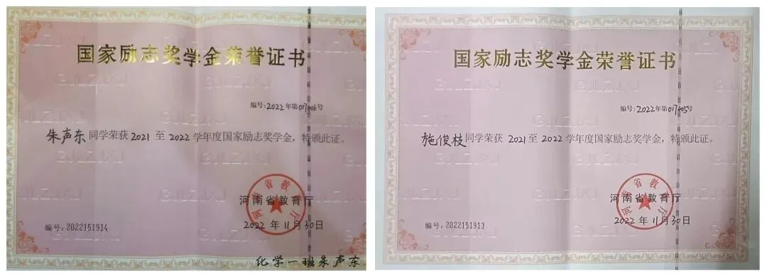 ▲ 图为 国家励志奖学金荣誉证书