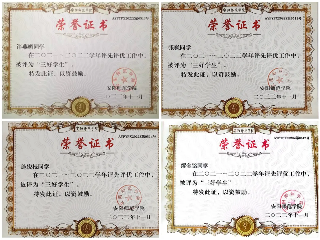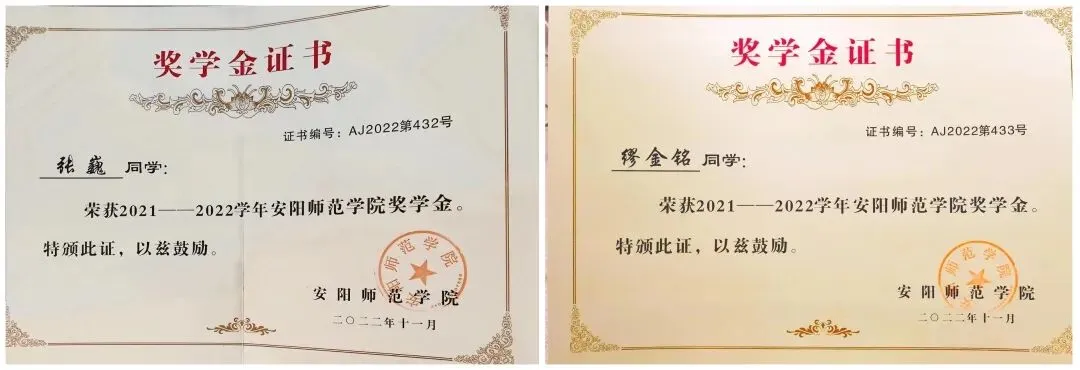 ▲ 图为 安阳师范学院奖学金荣誉证书