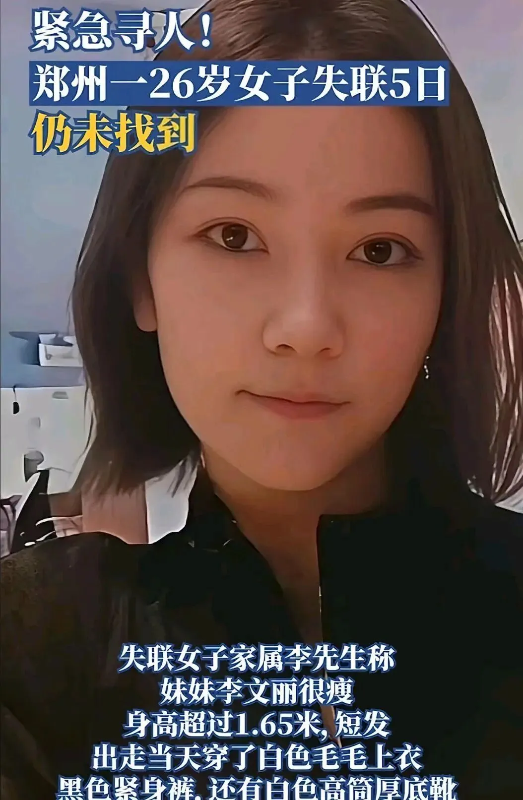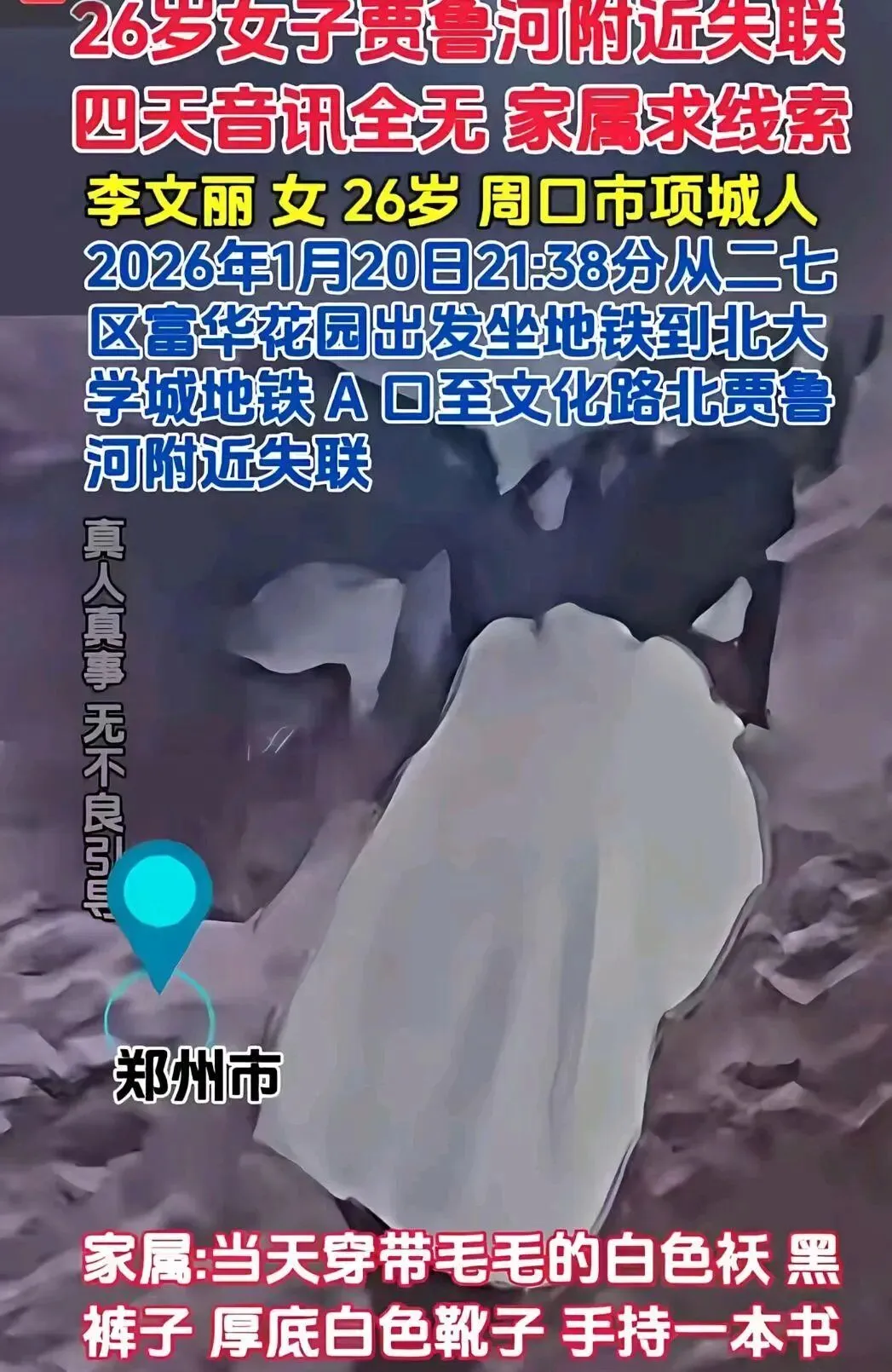 事件脉络2026年1月20日李文丽以“上夜班”为由离家,未携带手机等物品,仅带少量零钱,监控显示其走向贾鲁河方向后失联。
