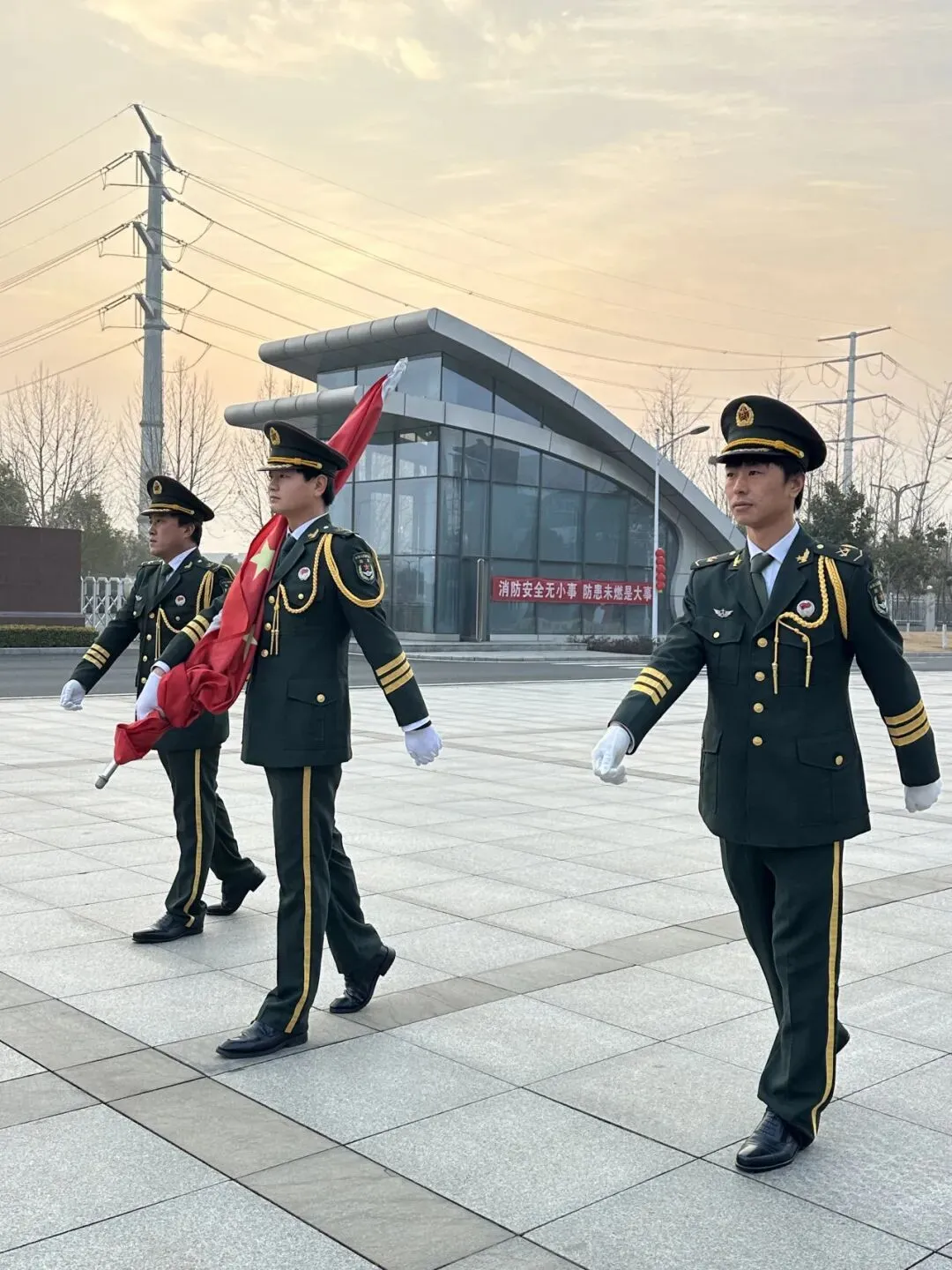 伴随着铿锵有力的指令,护旗手迈着坚定整齐的步伐,昂首阔步走向升旗台。他们身姿矫健、神情庄重,每一步都踏得沉稳有力,彰显着格力人的昂扬风貌。