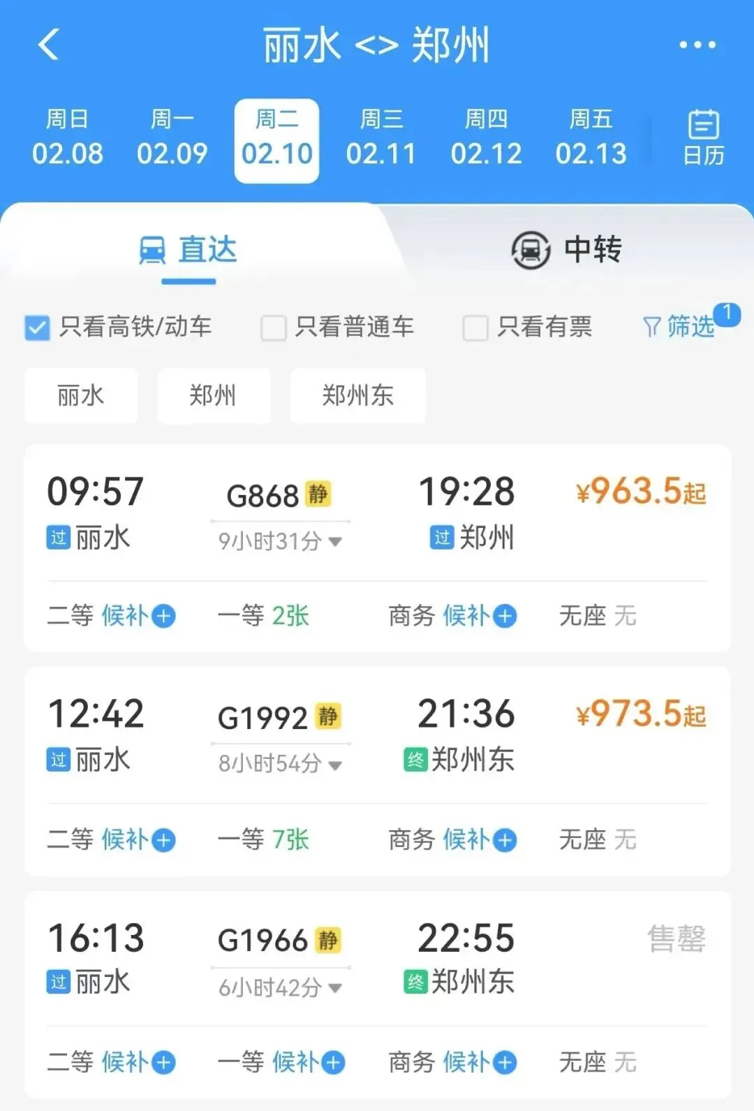 ✈ G54204 丽水19:00→21:15郑州