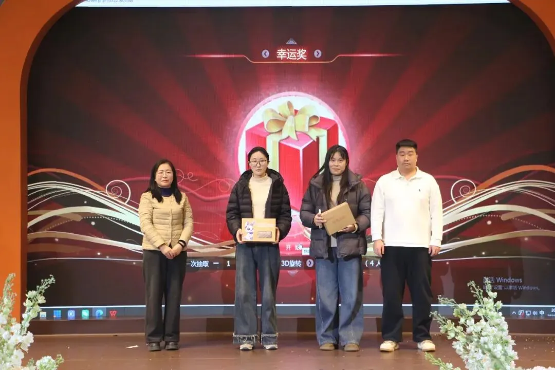 除了精彩的演出,现场设置的多轮抽奖环节和互动游戏环节更是将欢乐氛围推向顶点。特等奖、一、二、三、四等奖及幸运奖逐一揭晓,学校领导亲自为幸运教职工颁奖,每份奖品都承载着学校对大家的关怀与新春祝福。