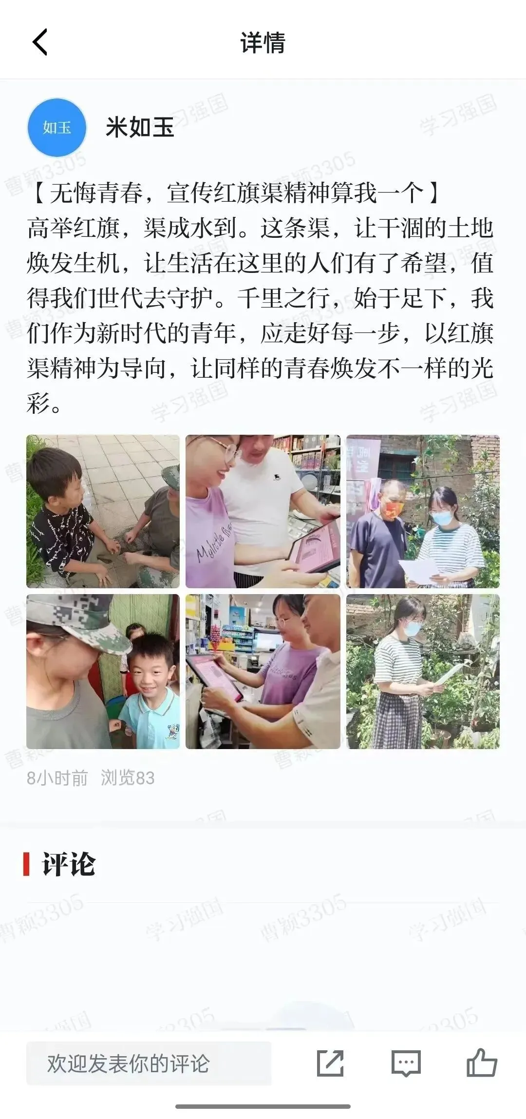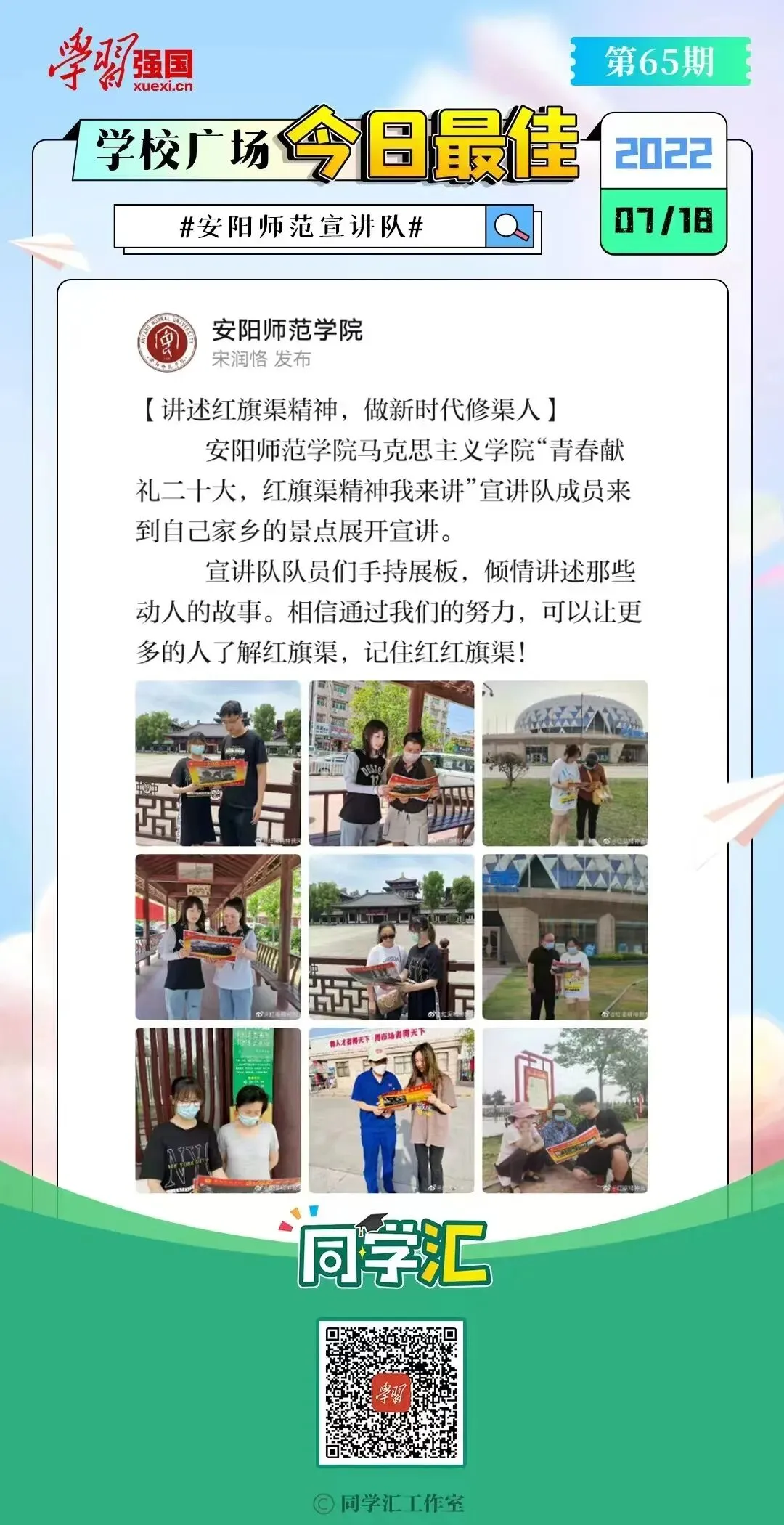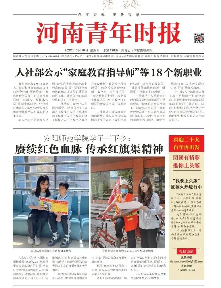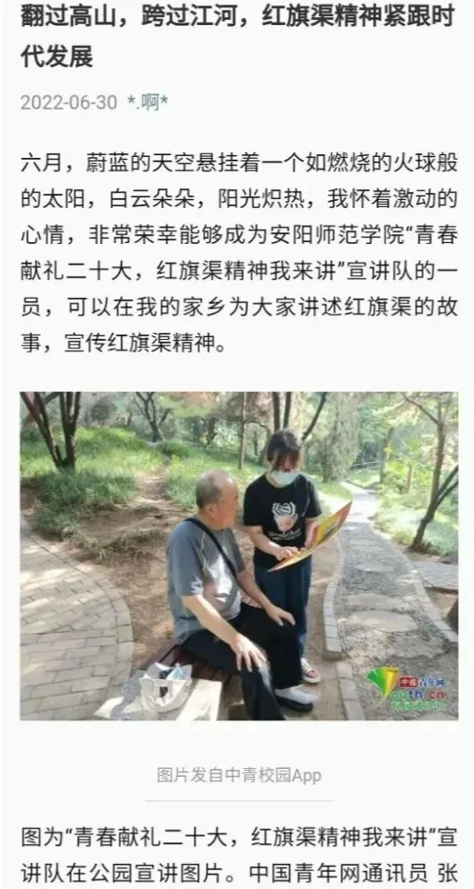 “青春献礼二十大,红旗渠精神我来讲”宣讲队成员线下前往家乡名胜古迹、乡村、街道展开实地宣讲;线上录制“红旗渠系列”微视频,学习宣传党的宝贵精神财富—红旗渠精神,从红色基因中汲取砥砺奋进的力量,赓续红色精神血脉,感悟党史蕴含的力量,在感动中传承红色文化,从而进一步理解体悟中国共产党人的初心与使命。
