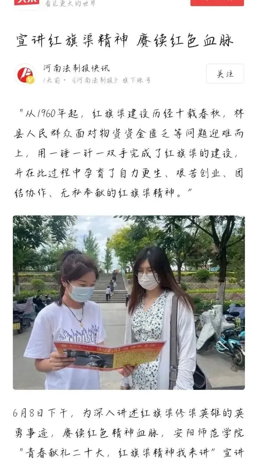 团队成员致力于通过实践让信仰之火熊熊不息、让红色基因融入血脉,以实际行动迎接党的二十大胜利召开,展现出青年团员的良好风貌。通过团队成员的宣讲,红旗渠精神愈加深入人心,走向群众。实践活动被《学习强国》《河南青年时报》《河南法制报快讯》《中青校园》报道。