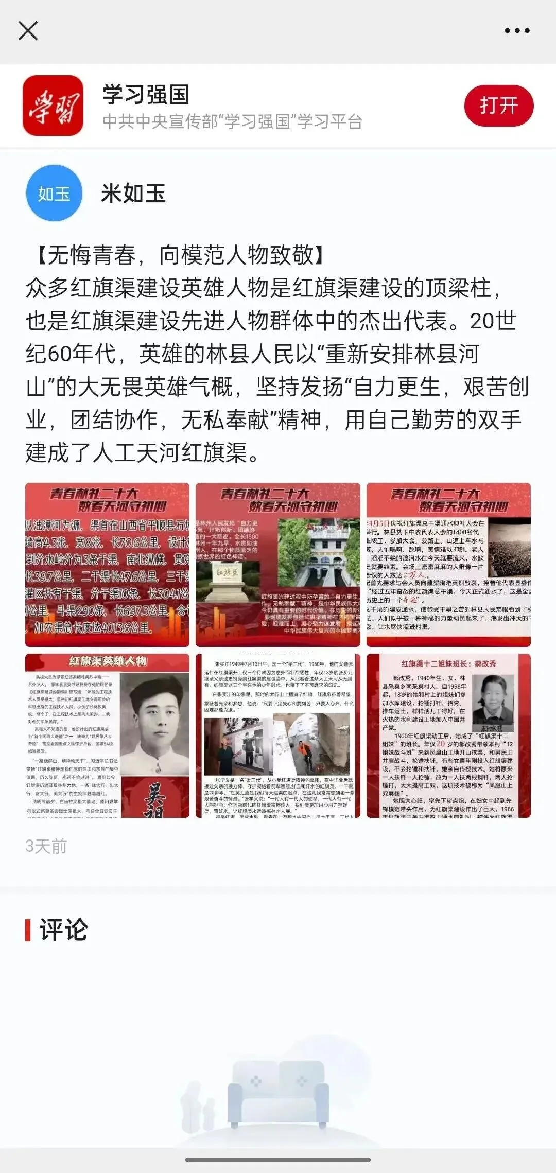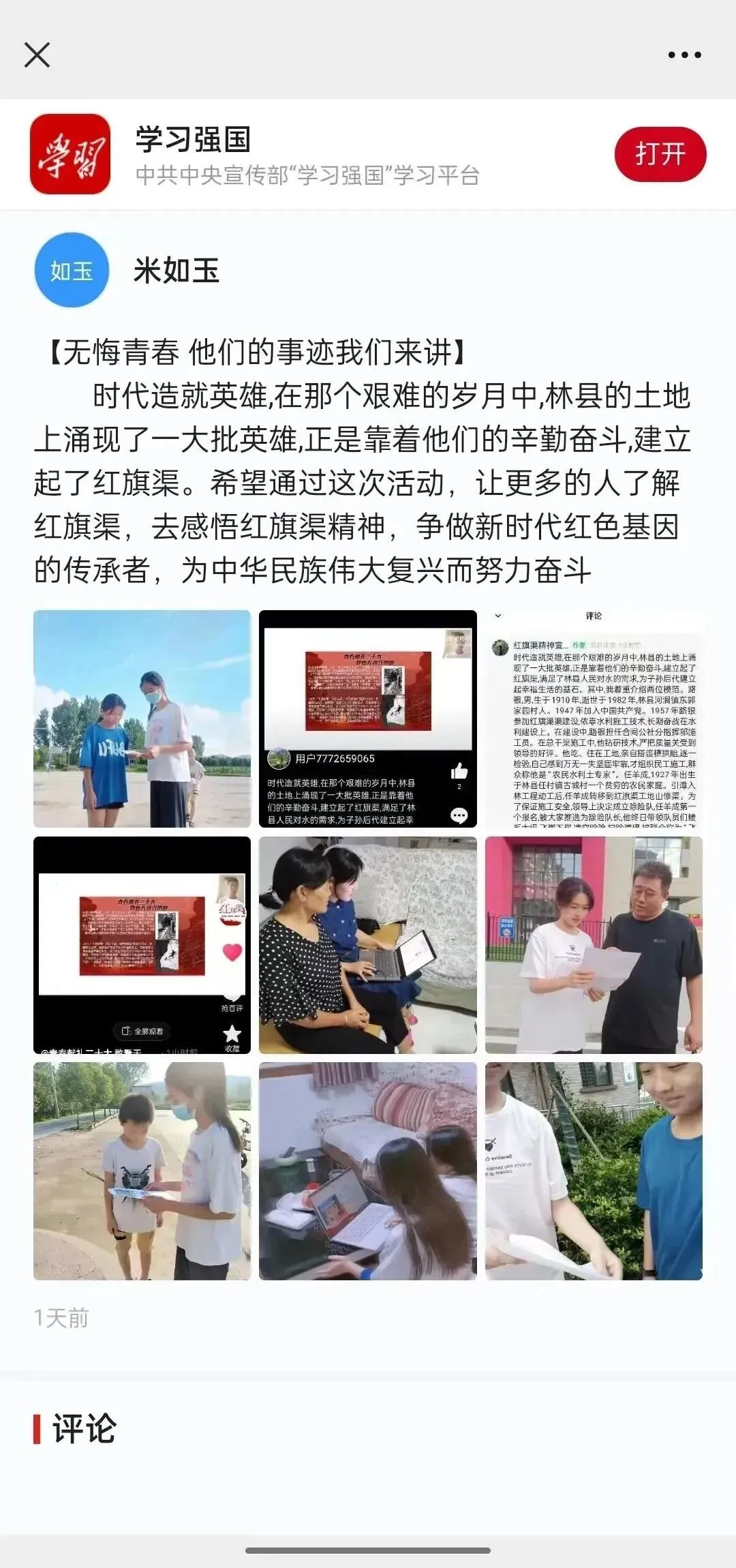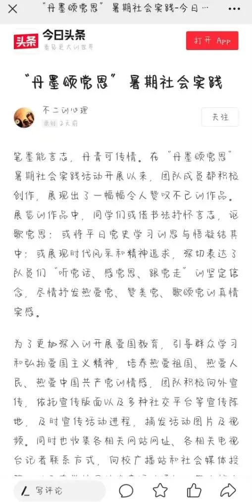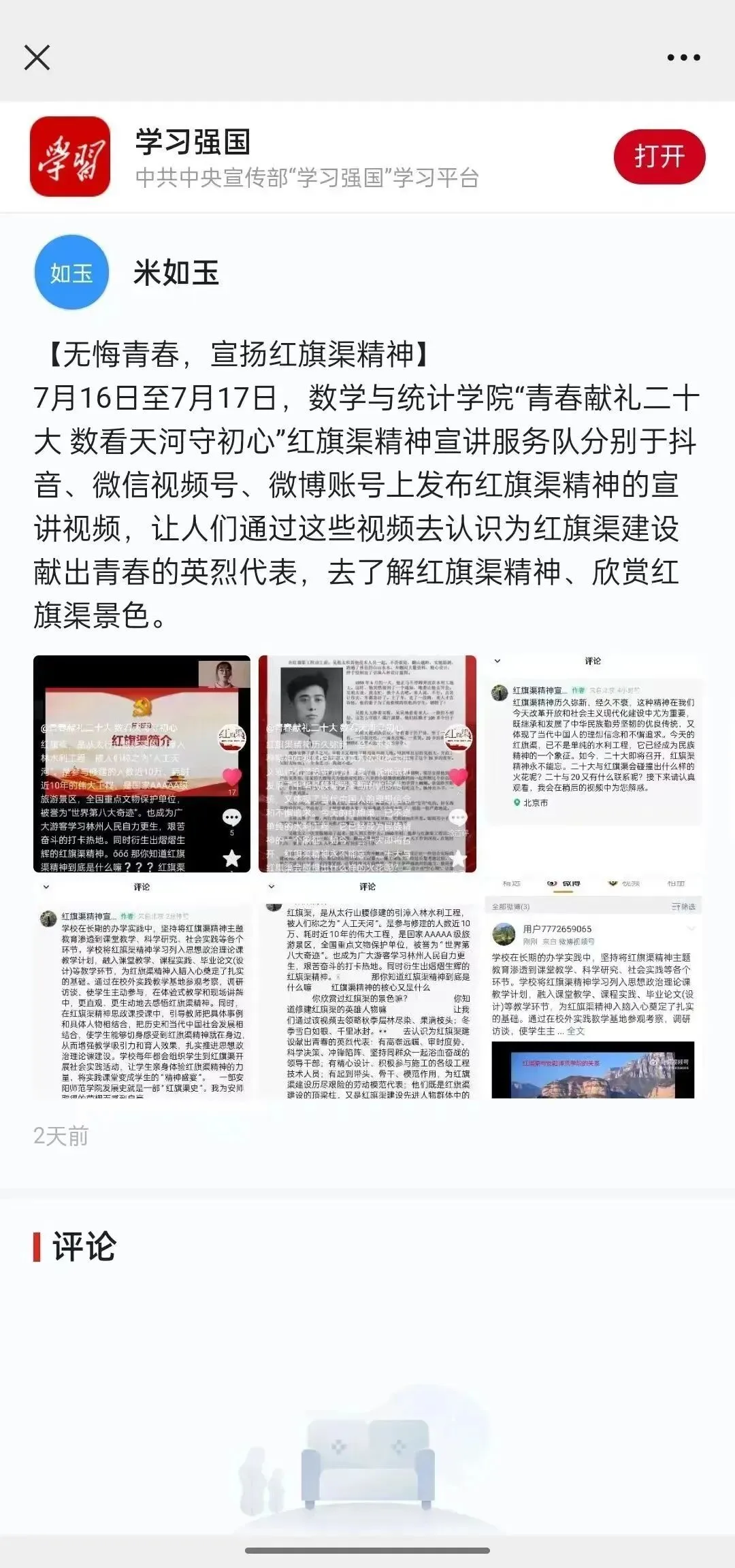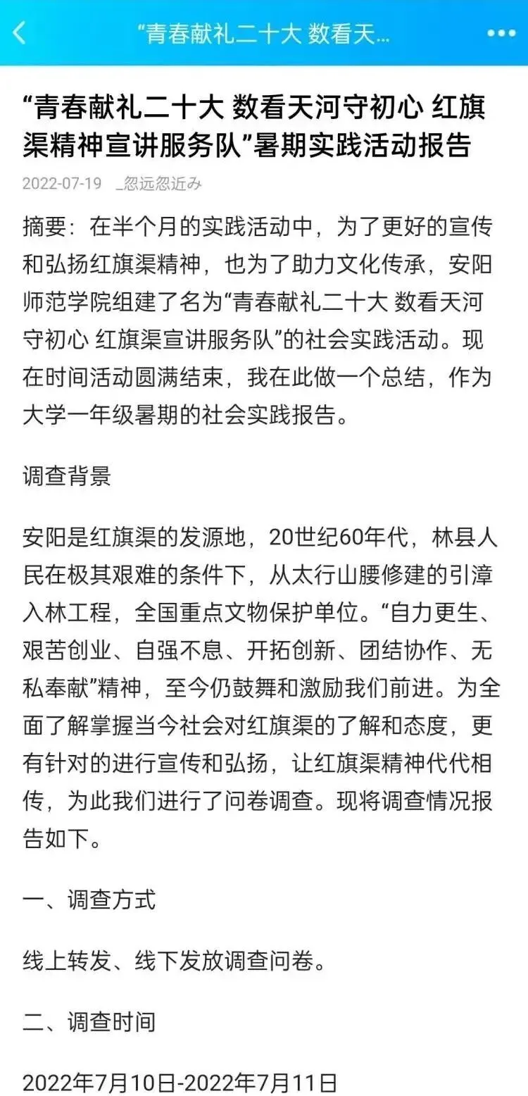 通过数据搜集和线上宣传的方式,队员们进一步了解红旗渠精神的“数字意义”。此次实践活动让更多的人从数字这个角度了解红旗渠,弘扬并传承红旗渠精神,不忘初心跟党走,迎接党的二十大胜利召开。实践活动被《学习强国》《中青校园》报道。