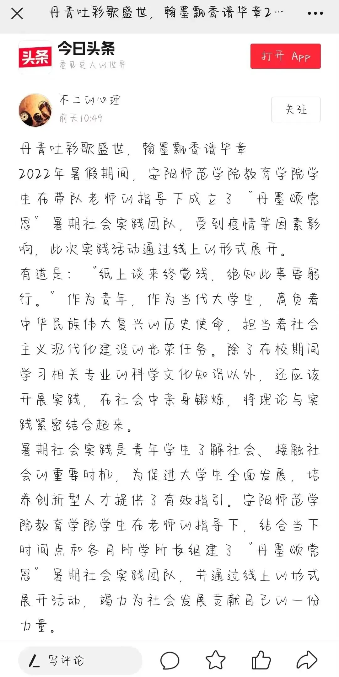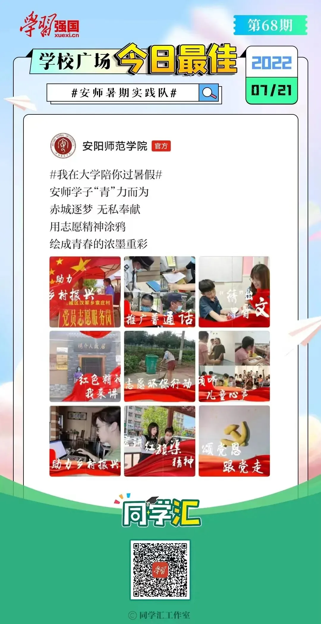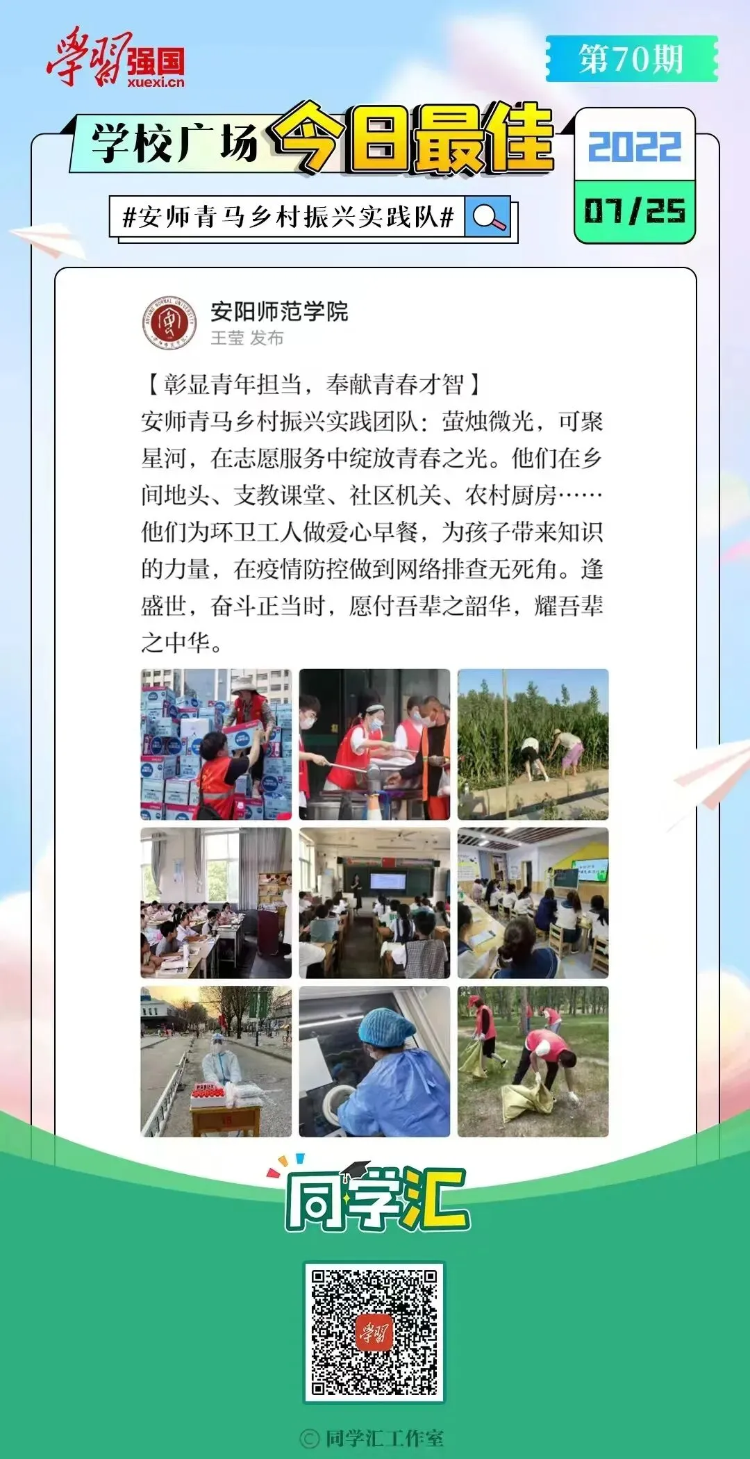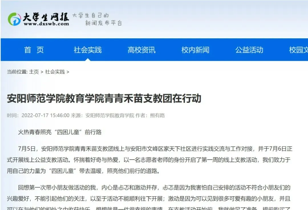 安阳师范学院把社会实践作为加强学生思想政治引领的重要抓手,不断完善社会实践协同育人机制,深化社会实践内涵式发展,“2+3+N”社会实践思路进一步深化,逐渐形成了实践主题聚焦、成果导向鲜明、育人实效明显、品牌影响力显著的实践育人格局,被《中国教育报》《河南日报》《安阳日报》、人民网、中国青年网等百余家媒体报道,微博、微信平台转发、推送16000余条,阅读关注总量达600余万次。安师青年深入基层、探访民生、了解国情,服务群众,展现了朝气蓬勃、积极向上、奉献祖国的优秀青年风貌,不断为社会发展进步贡献着属于安师学子的青春力量。