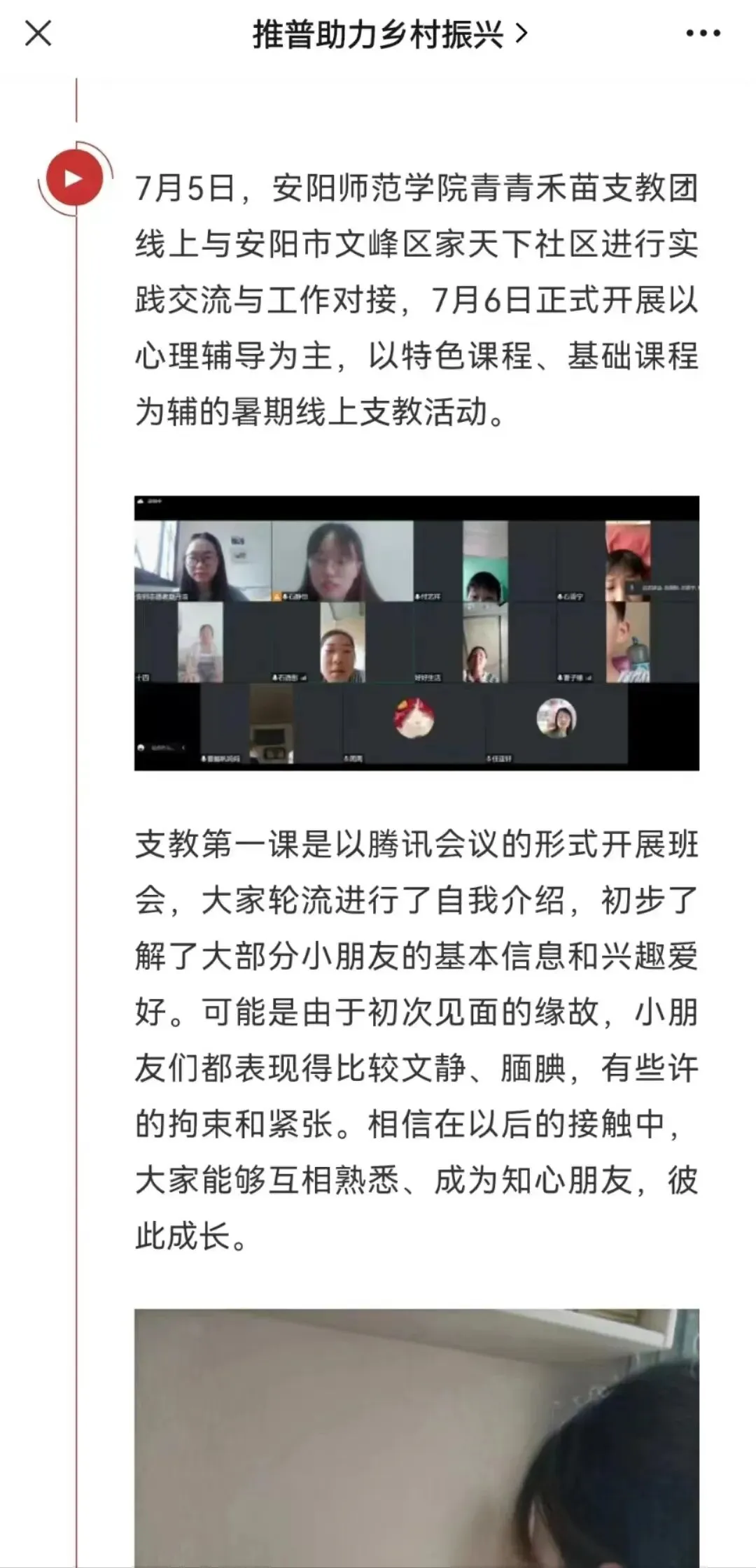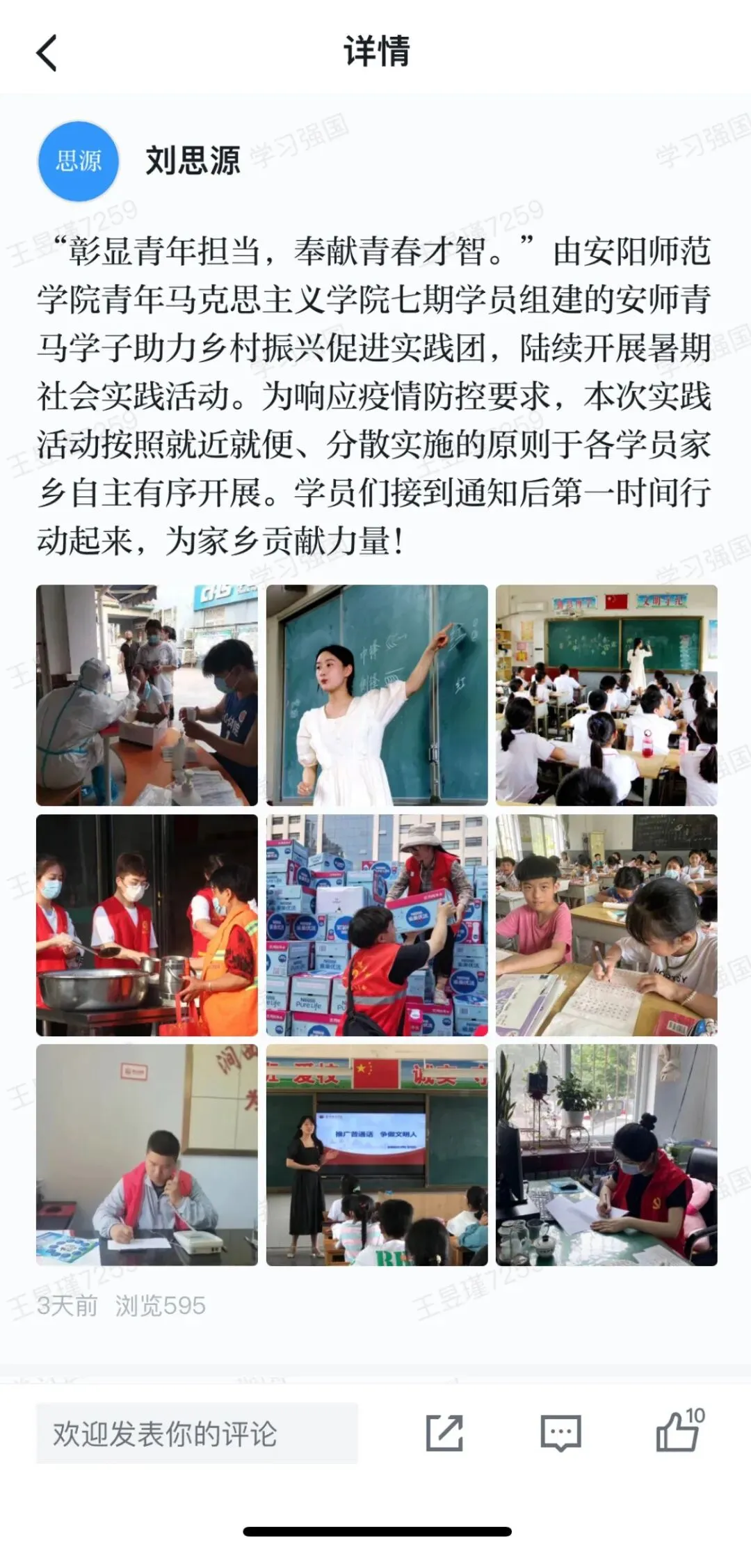 安师青马学子乡村振兴促进实践团利用暑期时间开展以“彰显青年担当,奉献青春才智”为主题的社会实践活动,按照就近就便、分散实施的原则,通过“河南共青团大学生向基层报道系统平台”报名挂职实践活动,在地方党政机关、事业单位承担具体工作,在社区、村或乡镇团委和村团组织的统筹下参与乡村社会治理、公共服务等领域的实践活动,参与当地扶贫济困、扶弱助残、课业辅导等主题的志愿服务活动等方式在各学员家乡自主有序开展实践活动。