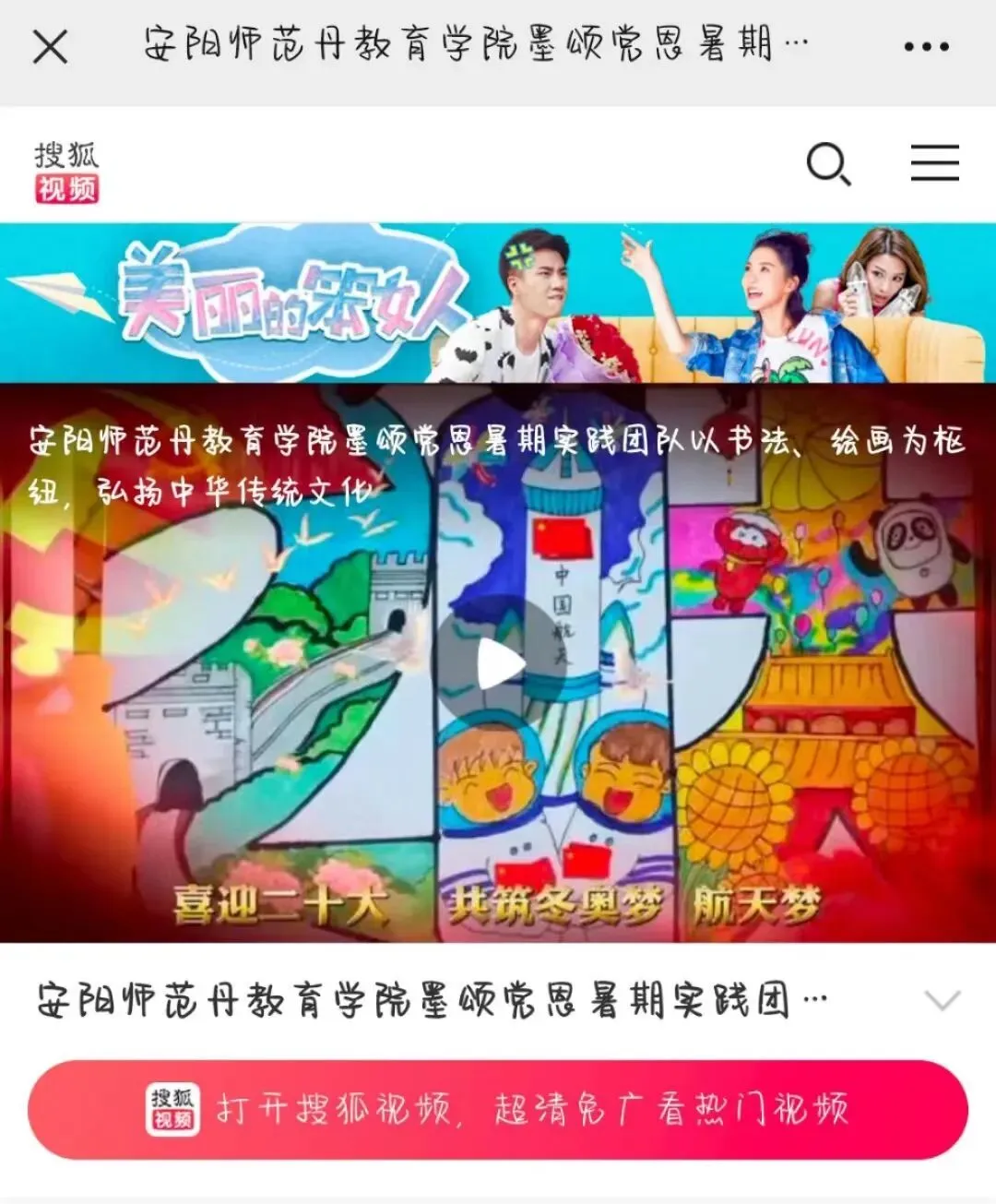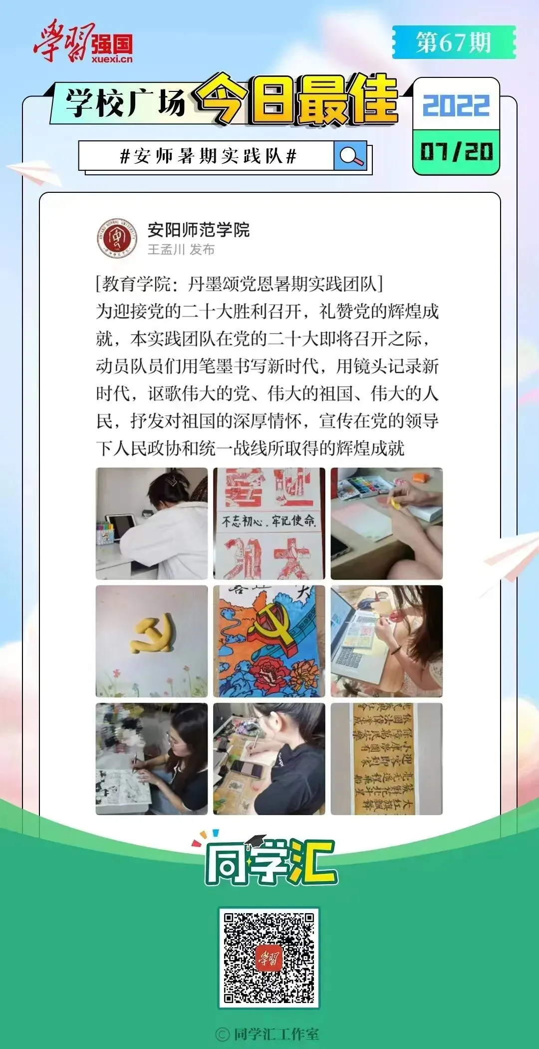 丹墨颂党恩暑期社会实践团队的成员们以迎接党的二十大为主题,录制实践视频,开展绘画和手工创作,宣传在党的领导下取得的辉煌成就;以书法、绘画为媒介,通过爱国主义教育,弘扬中华传统文化,积极推动中华优秀传统文化的传承发展。