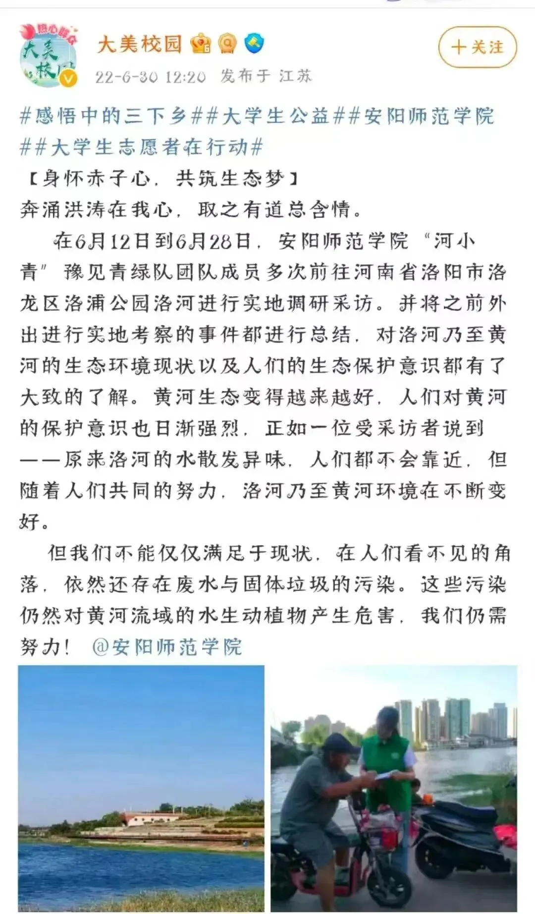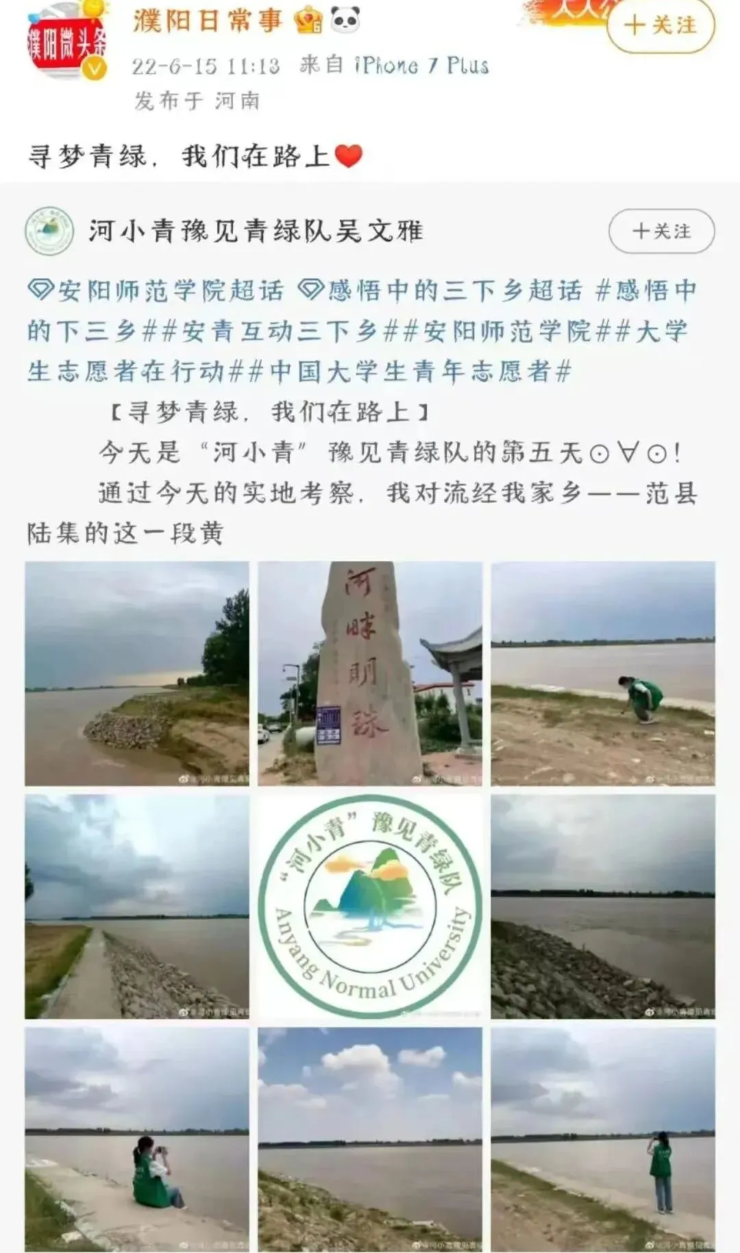 “河小青”豫见青绿队将活动分成黄河调研、微课录制、路人访谈及线上、线下宣传等板块,实践组成员走进黄河,拍摄地理位置介绍、水位测量、水质研究、居民采访等相关视频,将收集到的视频材料发布到团队公共微博及团队抖音,通过短视频的形式,进行保护黄河相关知识的宣传。