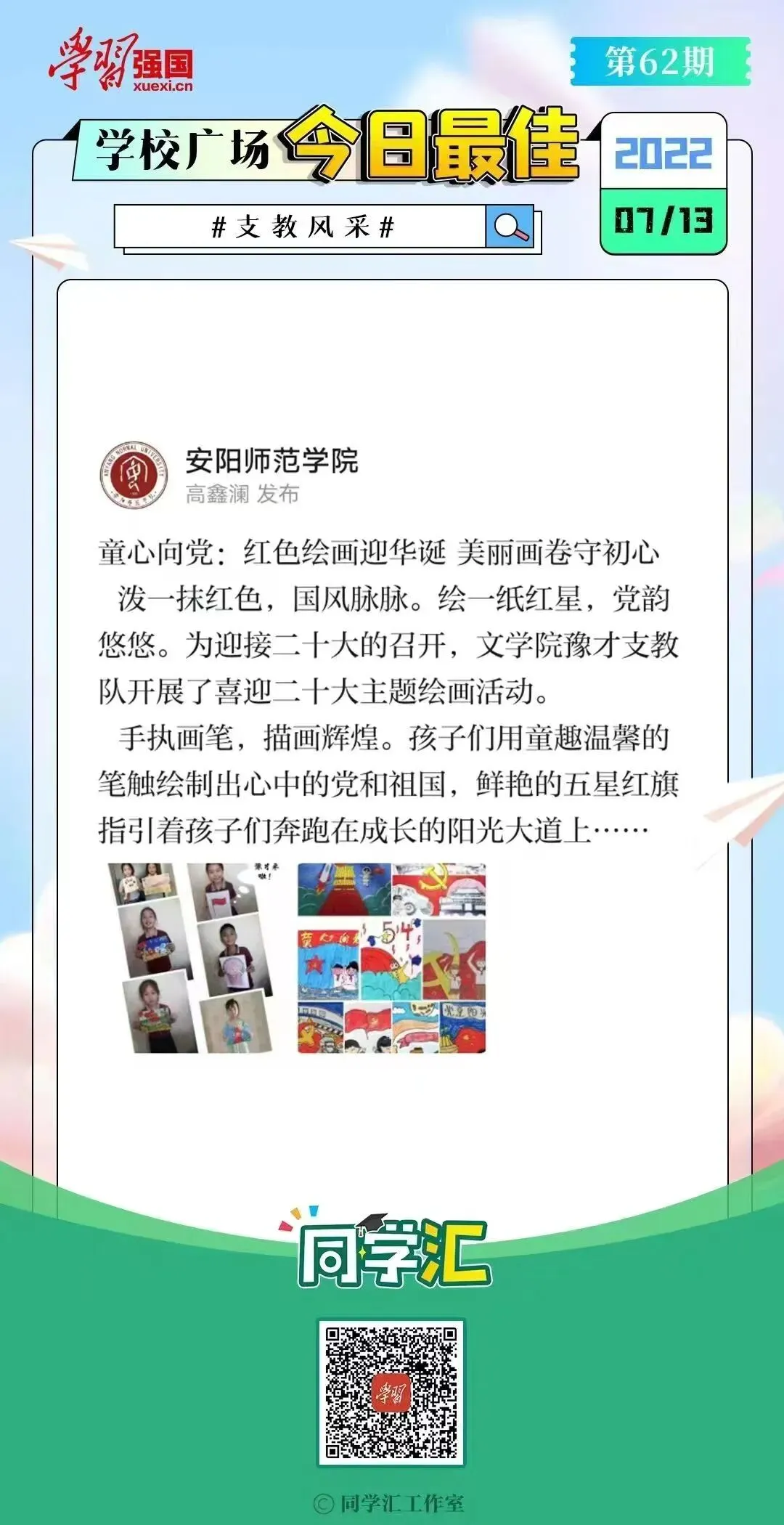 “一片甲骨惊天下,蕞尔一邑震寰宇”,“童心向党,筑梦成长”豫才支教队通过线上和线下相结合的模式向孩子们讲授甲骨文文化,支教队通过书写甲骨文、认识甲骨文表情包、合成甲骨文画等方式,在妙趣横生的互动中潜移默化地帮助了小朋友们了解和爱上了甲骨文。