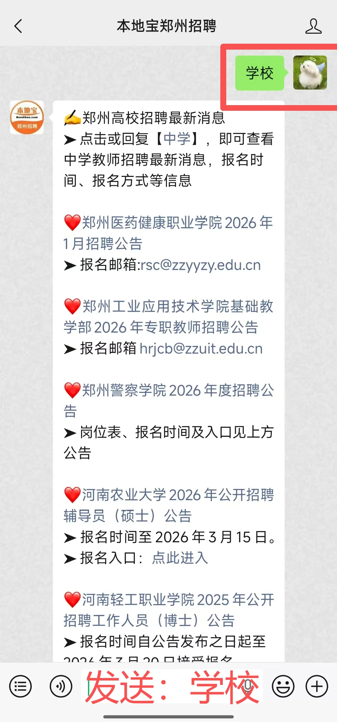 温馨提醒:您可以关注【本地宝郑州招聘】公众号,在聊天对话框回复【学校】即可获取更多学校招聘信息