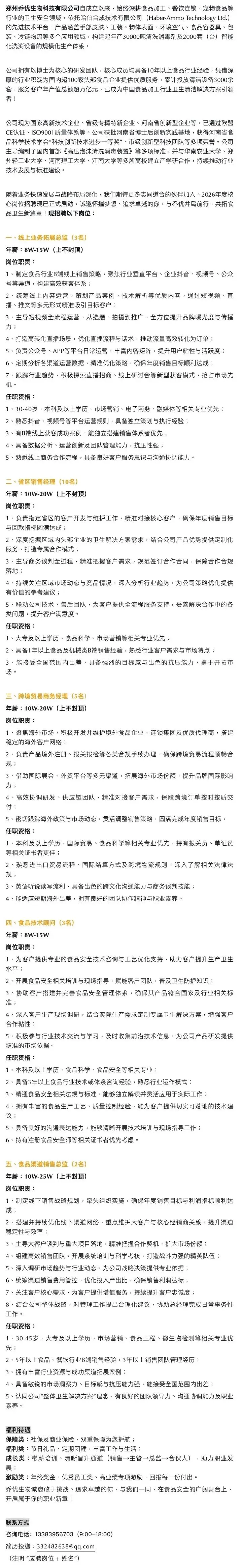 郑州乔优生物科技公司招聘