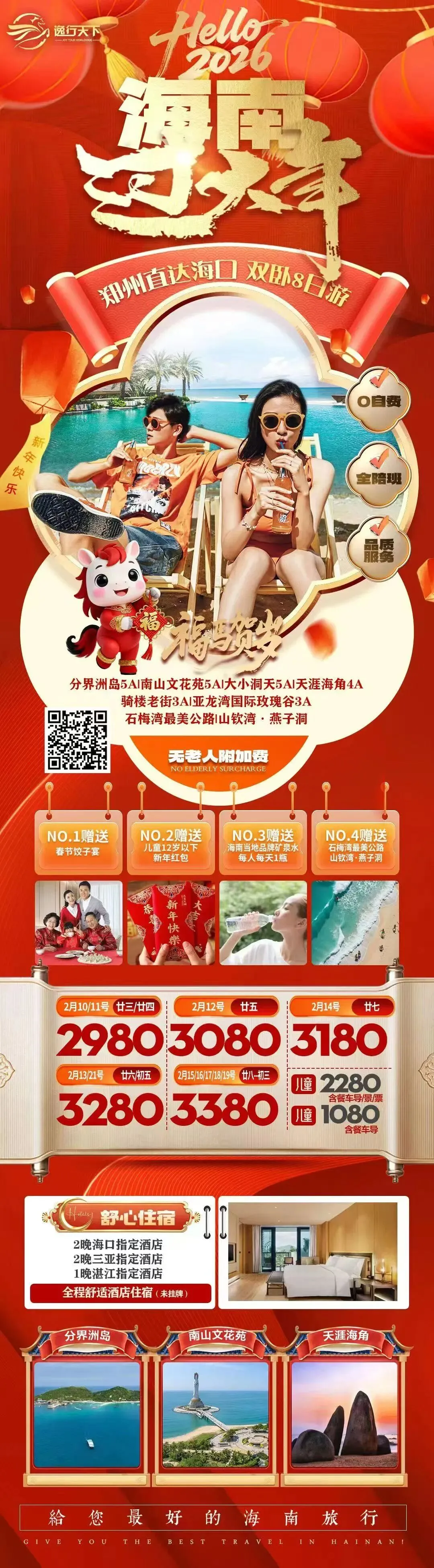 2.特别提示:岛屿类(蜈支洲岛、分界洲岛、西岛等)景区规定60岁以上及行动不便游客(包括孕妇)需写景区的免责声明方可登船上岛;70周岁以上老年人出于安全考虑,景区不予接待,请慎重选择。