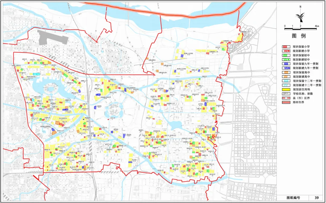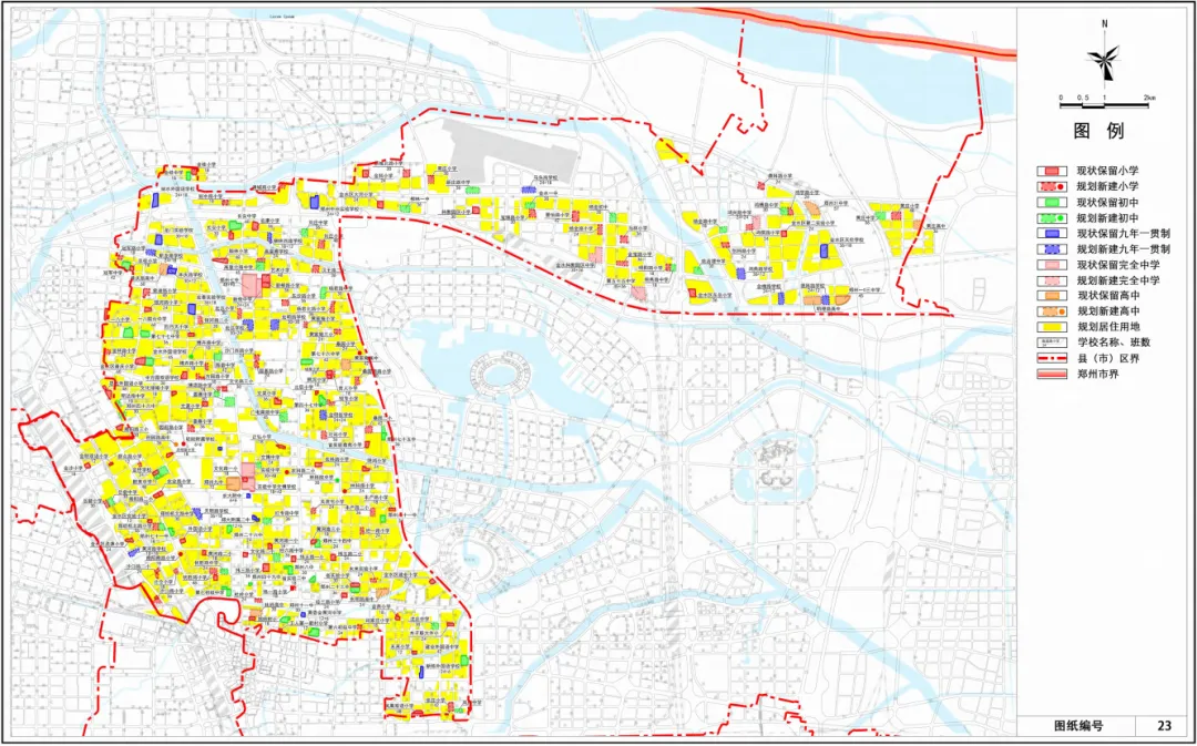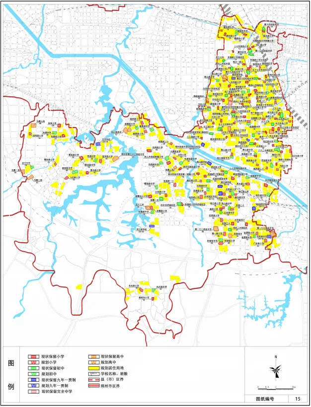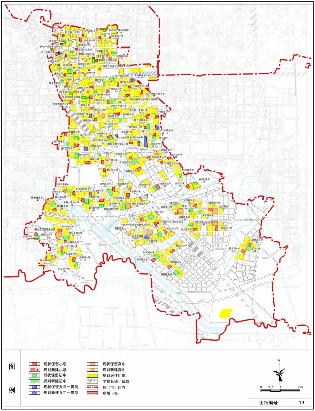 根据郑州市学龄人口预测,在学校生均用地面积符合要求、小学每班学生数量不超过 45 人、初中及普通高中每班学生数量不超过 50 人的前提下,经对现状学校的评估核算,规划如下: