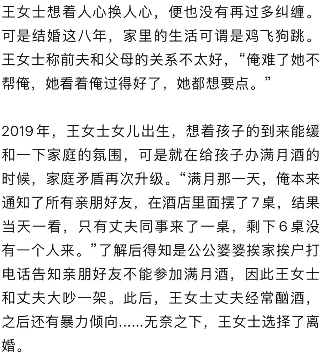 王女士表示,2015年自己和前夫通过同事介绍认识,彼此心生好感后决定裸婚。就在结婚前一晚,婆婆把她拉进屋里说:“这不是俺亲生的,你别给我提那么高的要求,就这以后你俩都好好孝顺我!”