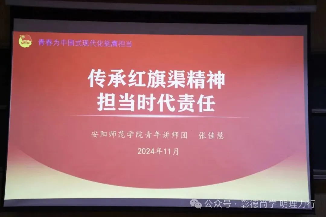 系列讲座的第一讲由张佳慧讲师主讲,她以“传承红旗渠精神,担当时代责任”为主题,深入解读了红旗渠精神的内涵和时代价值。张老师强调,红旗渠精神是中华民族精神的重要组成部分,是激励我们不断前进的强大动力。她鼓励学生们要学习红旗渠精神,勇于担当,为实现个人梦想和国家发展贡献力量。
