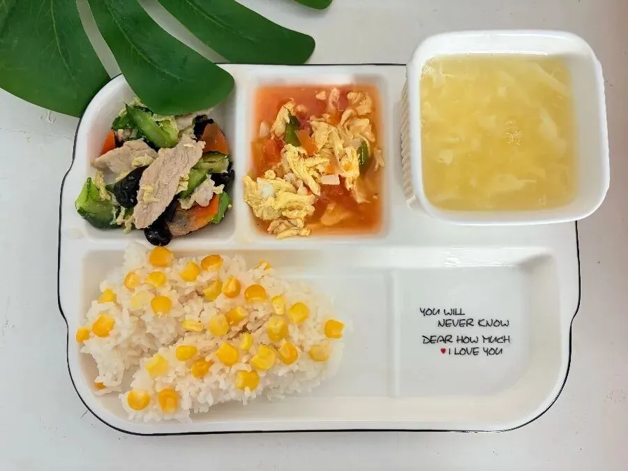 午餐:玉米粒米饭 木须肉 西红柿炒鸡蛋 凤凰玉米羹