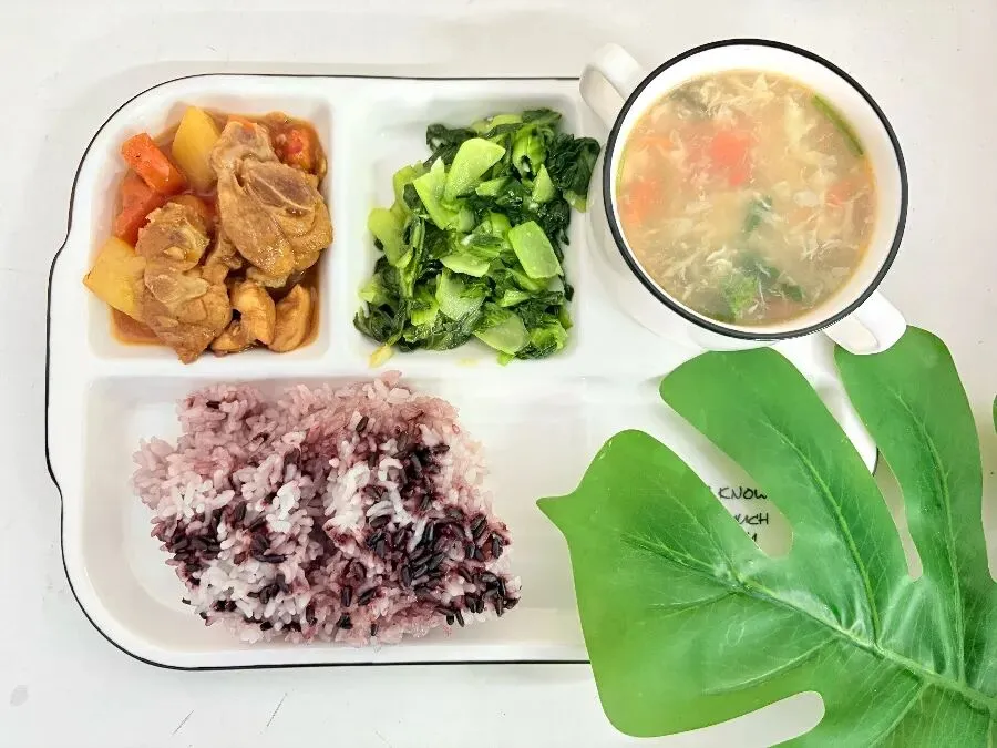 午餐:紫米饭 黄焖鸡 蒜香上海青 菌菇鲜汤