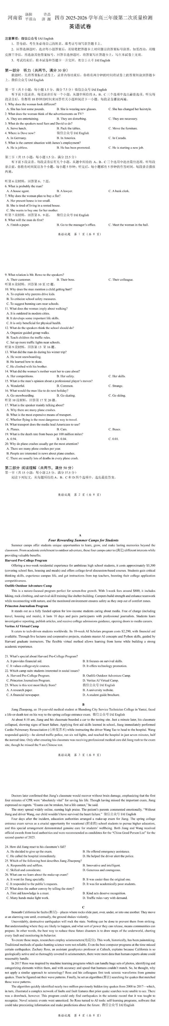 河南省洛阳、许昌、平顶山、济源四市2025-2026学年高三年级第二次质量检测英语试卷试题