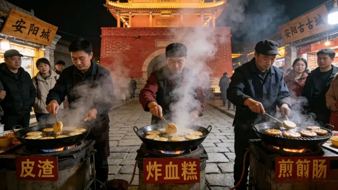 当夜色更深,古城街头“皮渣、炸血糕、煎灌肠” 等小吃摊的烟火气达到顶峰。这些名字粗犷、味道直接的美食,是安阳味道的底层代码。尤其是皮渣,用粉条、淀粉蒸制而成,可煎可炒可入烩菜,其“海纳百菜”的包容性,正是安阳古城气质的最好写照:古老却不迂腐,厚重而又鲜活,总能将不同时代的风味,巧妙地“烩”入自己的生活。