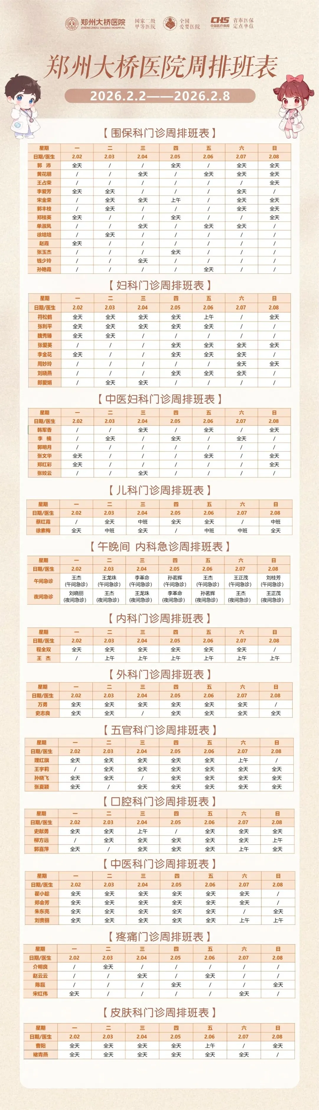 请收藏 ‖ 郑州大桥医院2月2日-2月8日门诊排班表