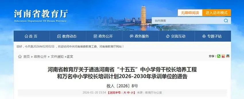 河南省近日启动“十五五”中小学骨干校长培养工程与万名中小学校长培训计划(2026—2030年),构建分层分类的校长成长体系。每年计划通过高水平基地培训约1300名中小学骨干校长。