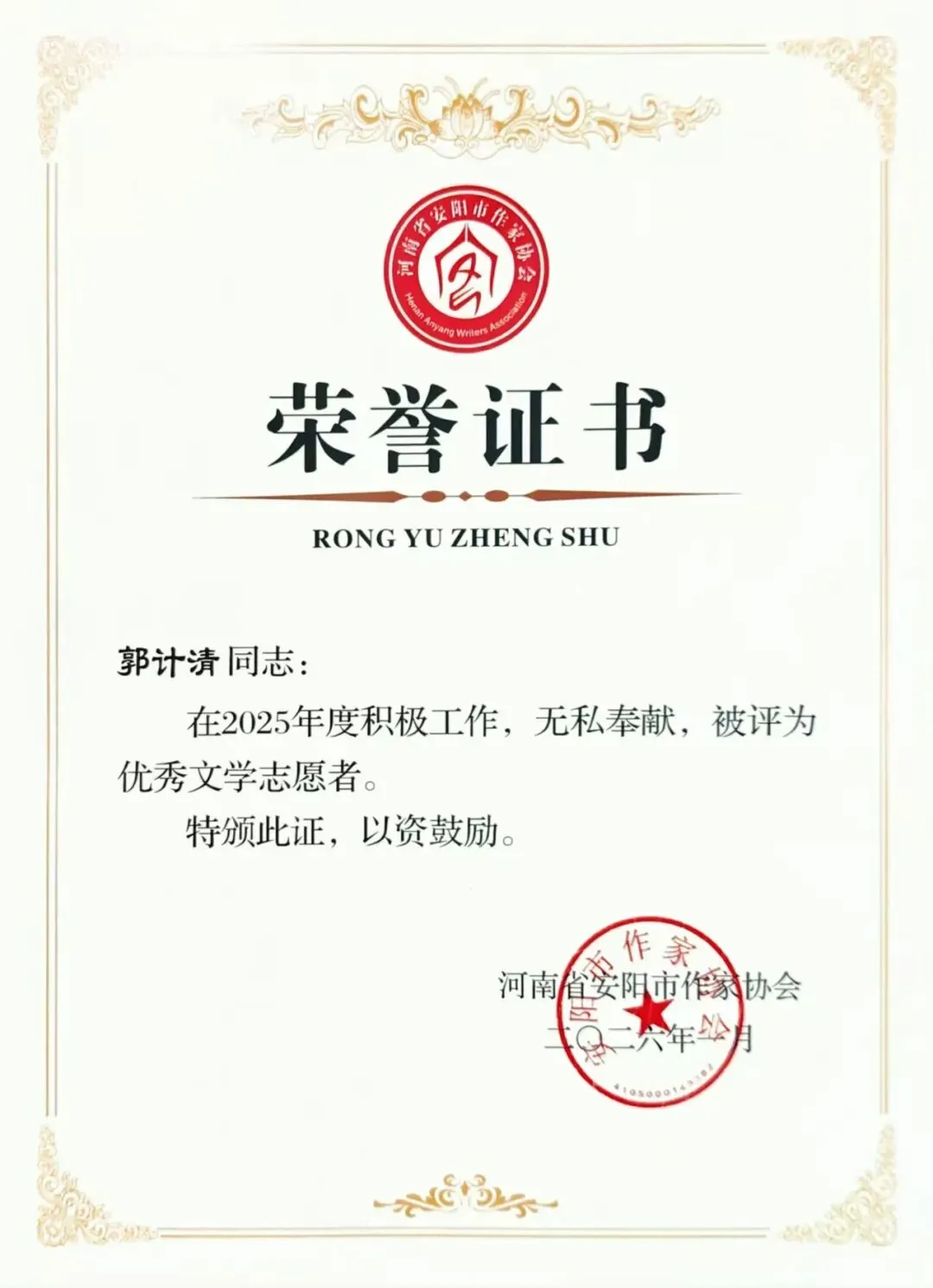 “优秀文学志愿者” 这一荣誉,不仅是对郭计清个人的认可,更是对河南兴瑞公司文化公益理念的高度肯定。正如真正的文艺志愿服务所倡导的,其核心要义在于以文艺专长为桥梁,主动、无偿地投身公益服务,用文字的力量传递温暖、凝聚人心。郭计清在工作之余,始终热心文学公益事业,积极参与各类文学志愿服务活动,或走进基层分享创作心得,或为文学新人答疑解惑,用笔墨为兴瑞发声,以行动为文化赋能,其坚守与付出正是优秀文学志愿者精神的生动写照。这份荣誉的背后,是个人对文学的赤诚热爱,更是企业对文化公益的大力支持,彰显了河南兴瑞 “以人为本、文化育人” 的发展理念。