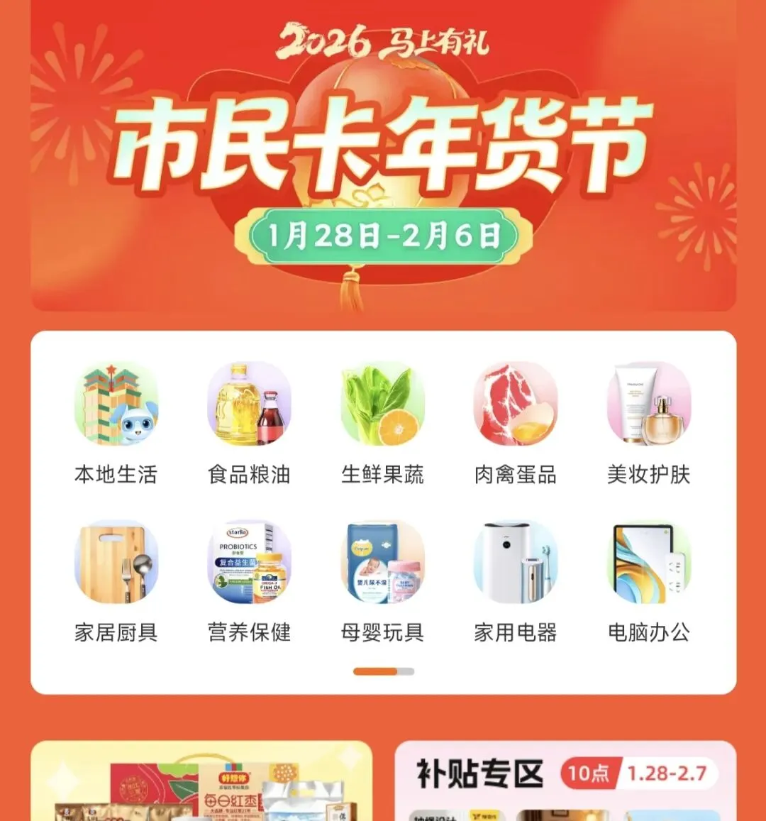 1月28日-2月1日每天10点,市民卡APP发放三档年货券:「满500减150」「满300减90」「满100减30」,每人限领1张;新用户福利:首次开通市民卡付款码,额外领「满30.01减30」无门槛券,线上商城米面粮油、年货礼盒都能买。