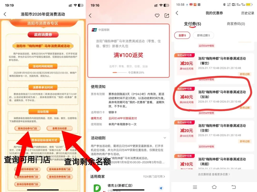 以上消费券可在活动周期内,在洛阳市辖区内任意参与活动的商家核销。包含中石油中石化加油站,可以叠加洛阳地区加油机直降的优惠!