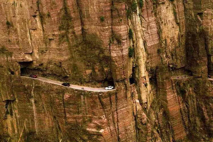 没有电,没有机械,甚至连像样的安全绳都没有。他们在崖壁上凿出一个个脚窝,人悬在半空,一锤一锤往石头里砸。钢锤砸钝了,就在石头上磨;手磨出了血泡,裹上布条继续干。5 年时间,1300 米的悬崖被凿出一条路,洞顶的石缝里还留着当年钢锉划过的痕迹,像一道道倔强的伤疤。