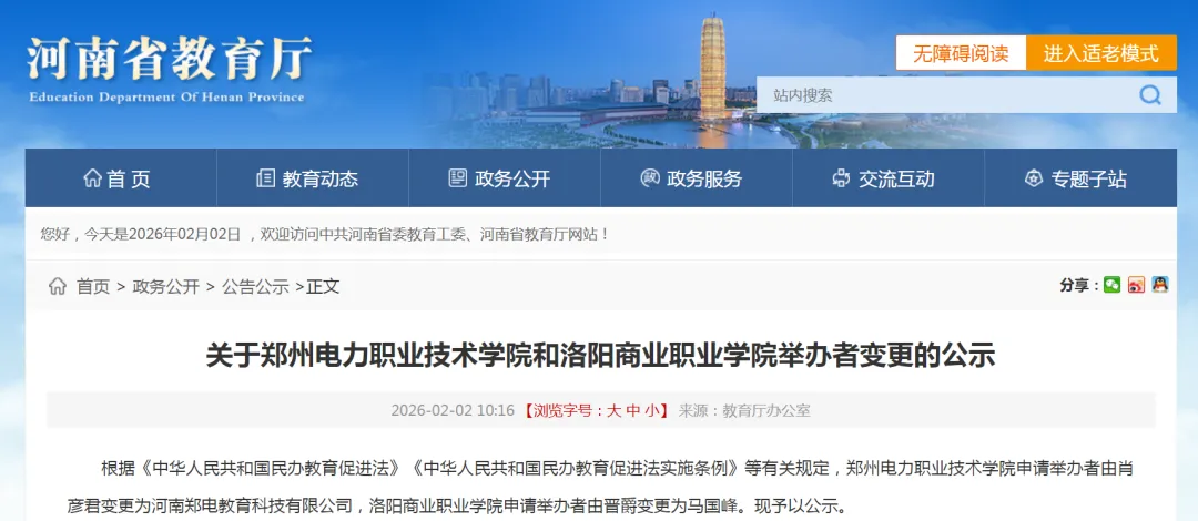 高教网讯 2月2日,河南省教育厅发布一则关于郑州电力职业技术学院和洛阳商业职业学院举办者变更的公示信息。