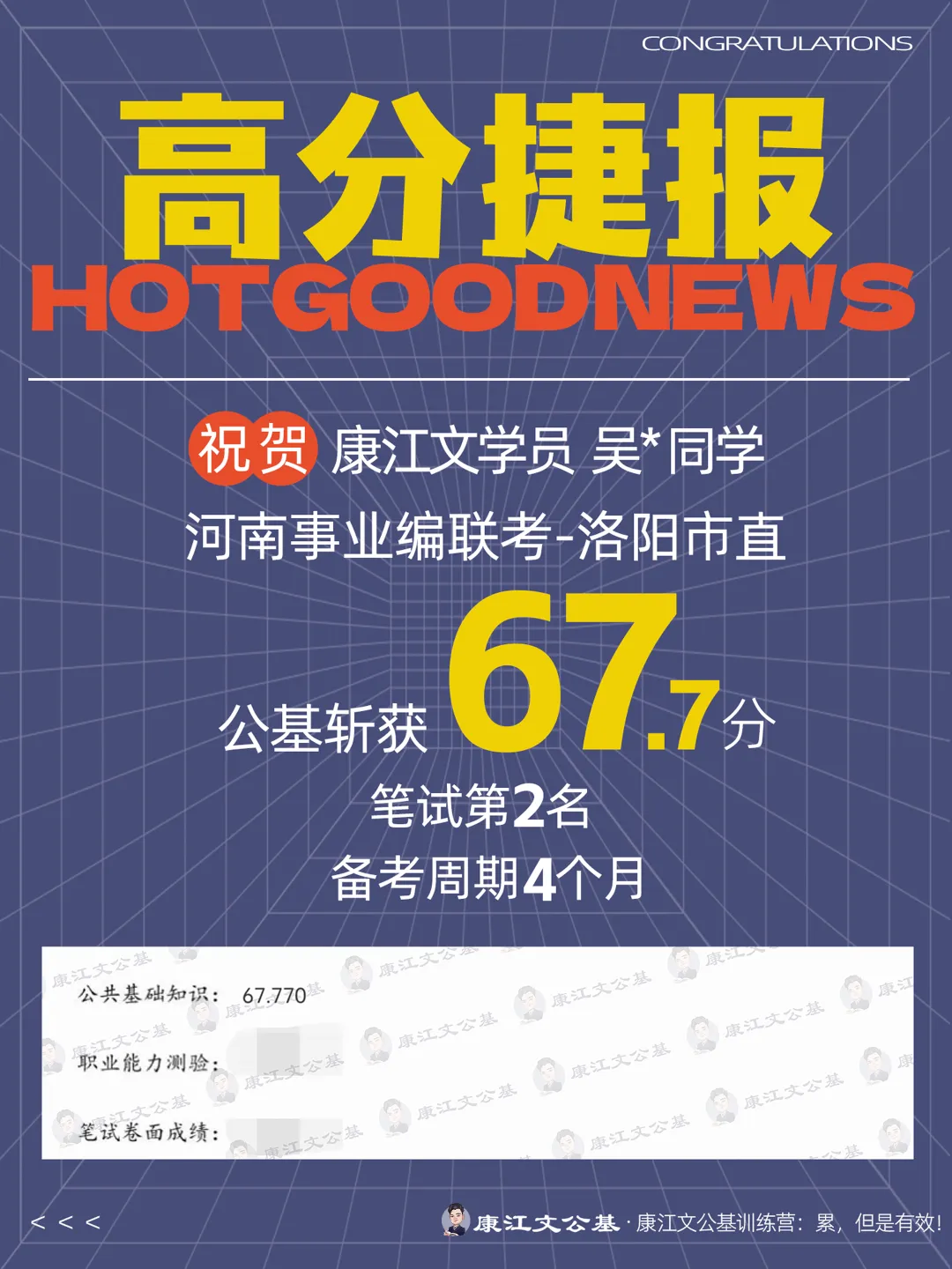 哈喽各位考编er,今天给大家分享一则康江文公基魔鬼训练营的上岸捷报——恭喜吴*同学公基67.7分成功进面洛阳事业编!