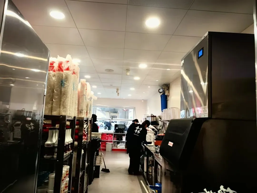 在一层售卖区,记者看到,南侧是茶饮操作区,各类操作工具和容器已全部到位;东侧是收银和出餐区,该区域的收银台和成袋的吸管也已摆放到位。