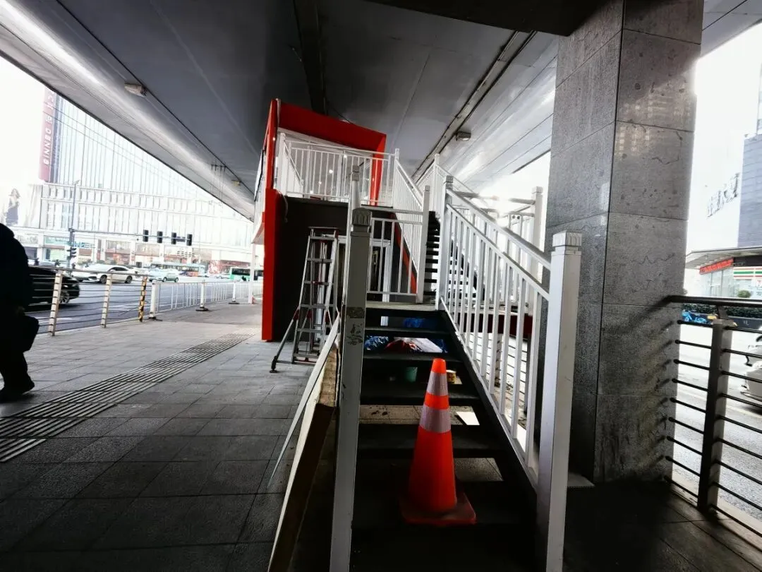 由此,从一层通往二层的台阶处摆放了三角锥,暂不方便人员登往二层。