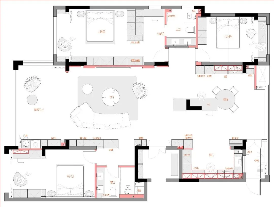 落地窗引入充足自然光,光影交错间,让整个客厅既有大户型的阔绰气场,又不失家庭的温馨质感。闲暇时,家人围坐聊天,或约上好友小聚,这里既是社交主场,也是放松身心的港湾。