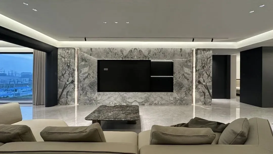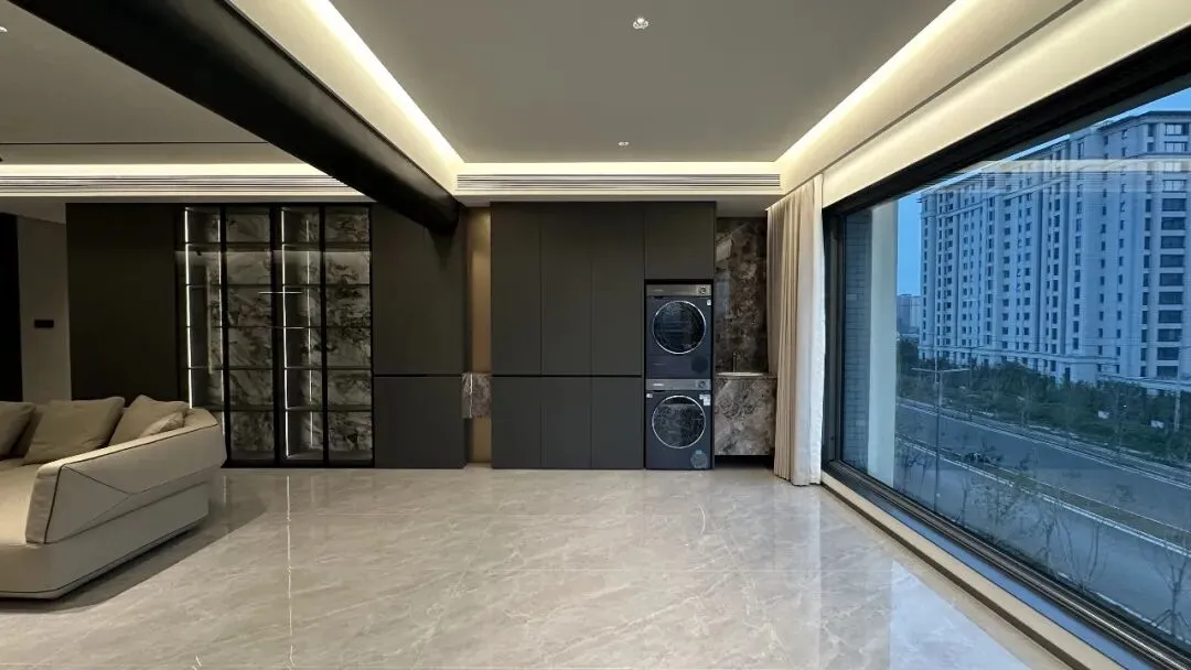 厅的 “开阔感” 被发挥到极致。设计师采用无主灯设计,搭配悬浮吊顶与线性灯带,让空间光线均匀柔和,瞬间拉高层高视觉感。大面积的浅灰色地砖通铺,延伸了空间边界,与米白色的墙面形成干净通透的基底。