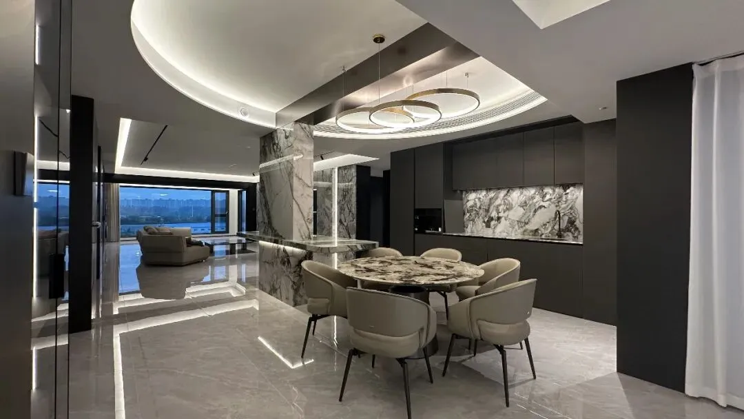 餐厅与客厅相连,设计上延续了整体的意式轻奢基调,同时注重用餐仪式感。椅面采用皮质包裹,触感舒适,椅腿的金属包边细节与客厅家具形成呼应,整体风格统一和谐。