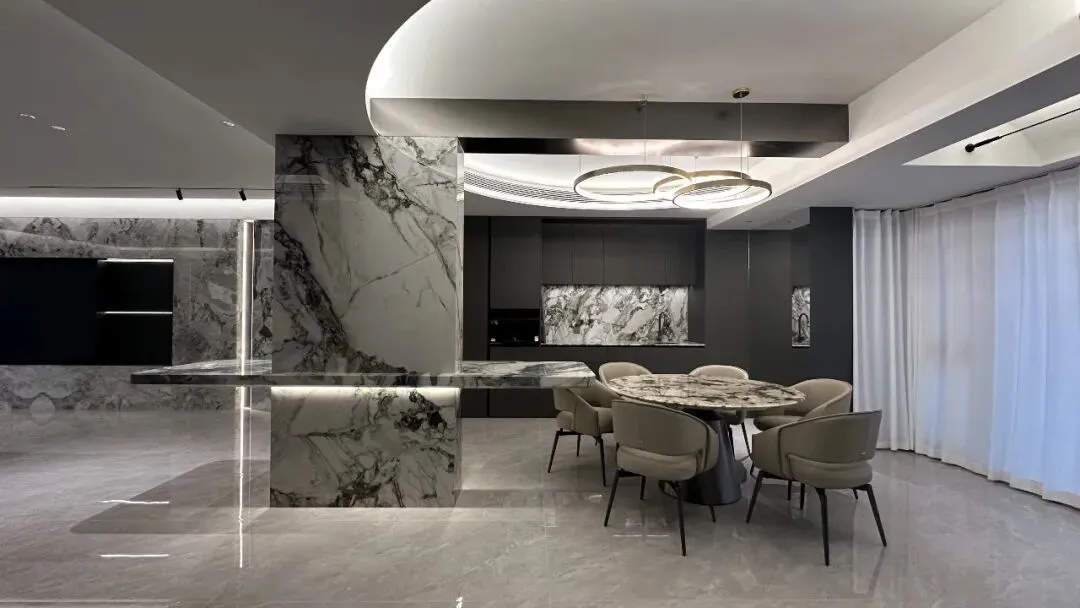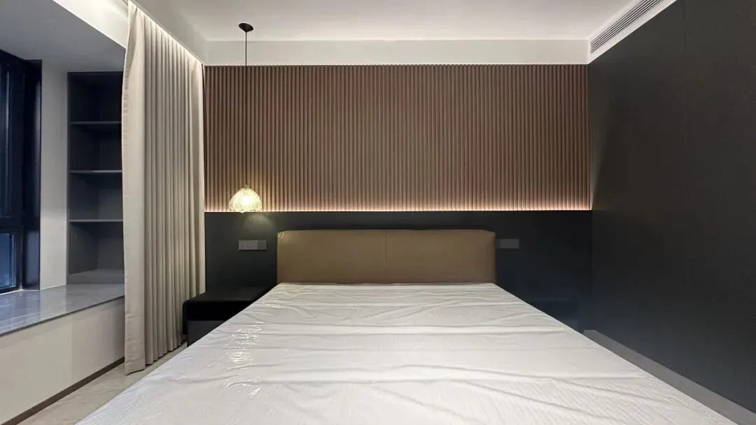 餐厅背景墙采用半墙岩板 + 金属线条装饰,搭配一组悬浮式餐边柜,白色柜体与金属拉手结合,既增加了收纳空间,又让空间更显整洁大气。天花板悬挂一组金属质感的吊灯,灯光垂直洒在餐桌上,为每一顿饭菜镀上温暖光晕。在这里,早餐的匆忙、午餐的惬意、晚餐的温馨都能被好好承载,让三餐烟火也能充满仪式感。
